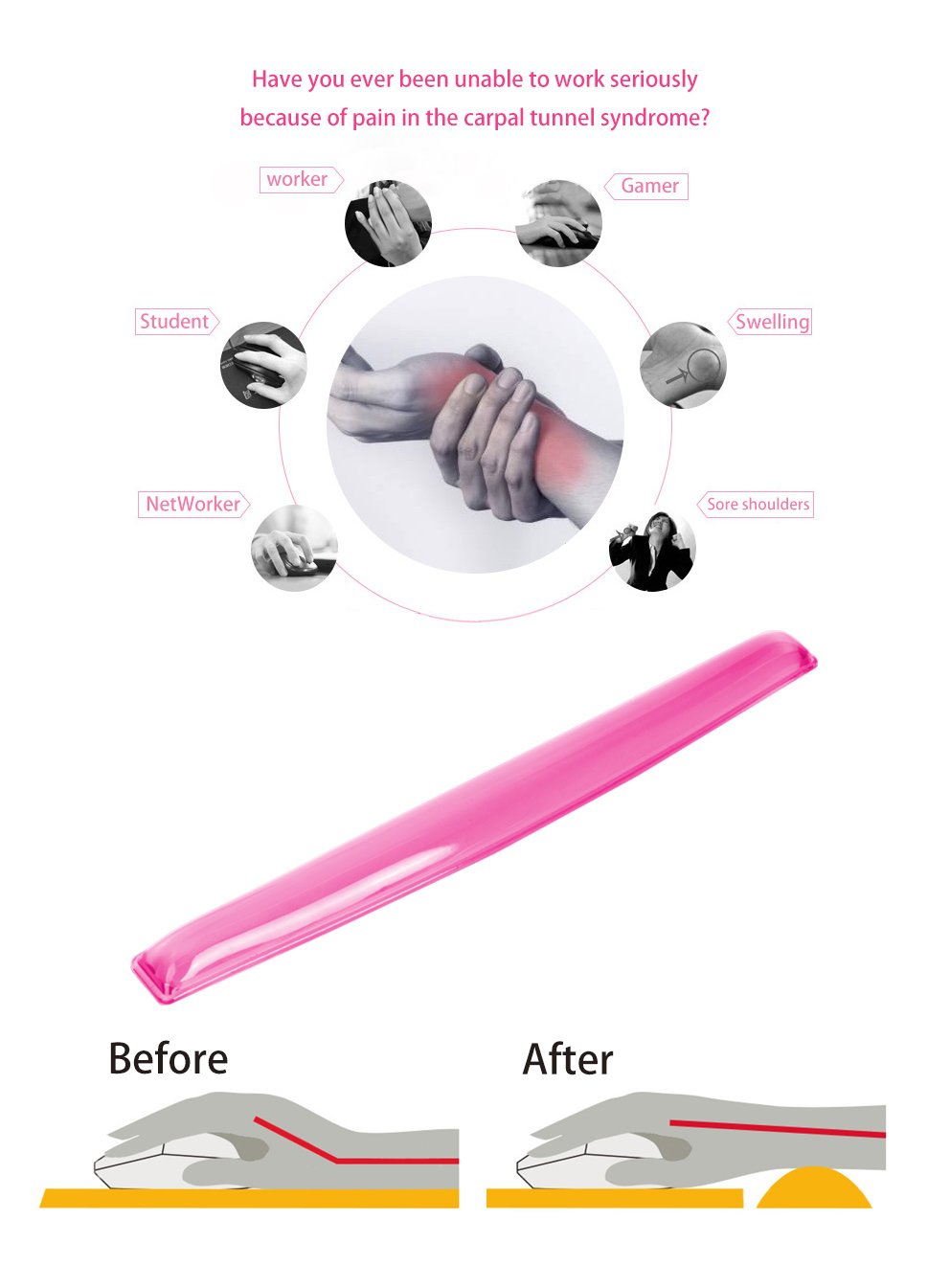 • 【Avoid injury & Relieve pain 】Soft gel wrist rest pad prevents damage from repetitive stress disorders ,it helps to avoid joint and wrist problems and relieve pain (rheumatoid arthritis, carpal tunnel syndrome).