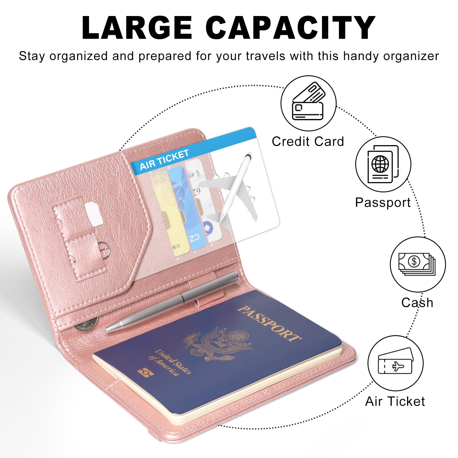 ACdream RFID BLOCKING Passport Holder Travel Wallet, Premium PU Leather Cover Passport Book with Card Holder, Pen Holder, Keep Organization, and Travel Essentials for Women and Men, Rose Gold