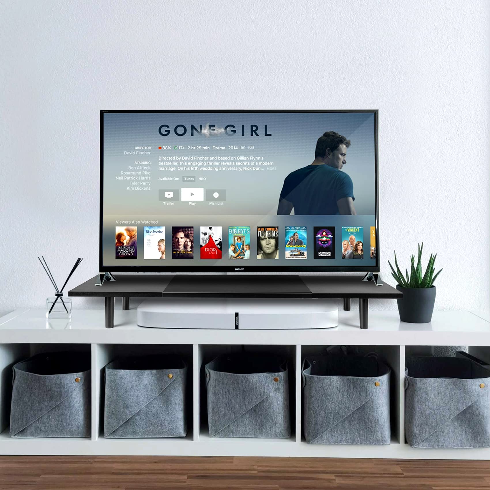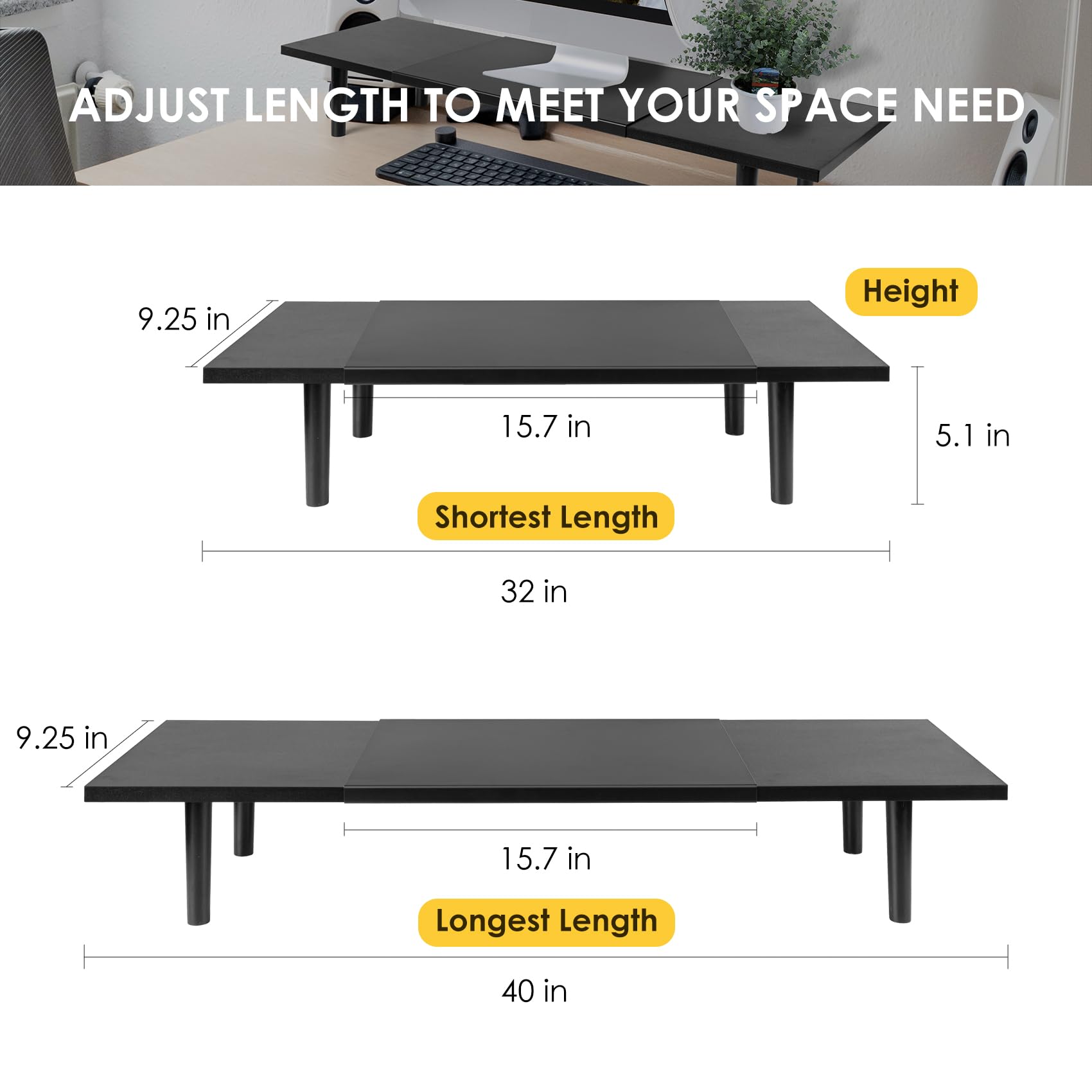 • ADJUSTABLE LENGTH MONITOR STAND:The length of the dual monitor riser for desk can be retractable from 32 in to 40 inch, you can flexibly adjust length according to the space and the different size of screen. You could adjust to the short length when you only need single monitor to save space. Adjusting to the long length if you need multiple computers to work at the same time.