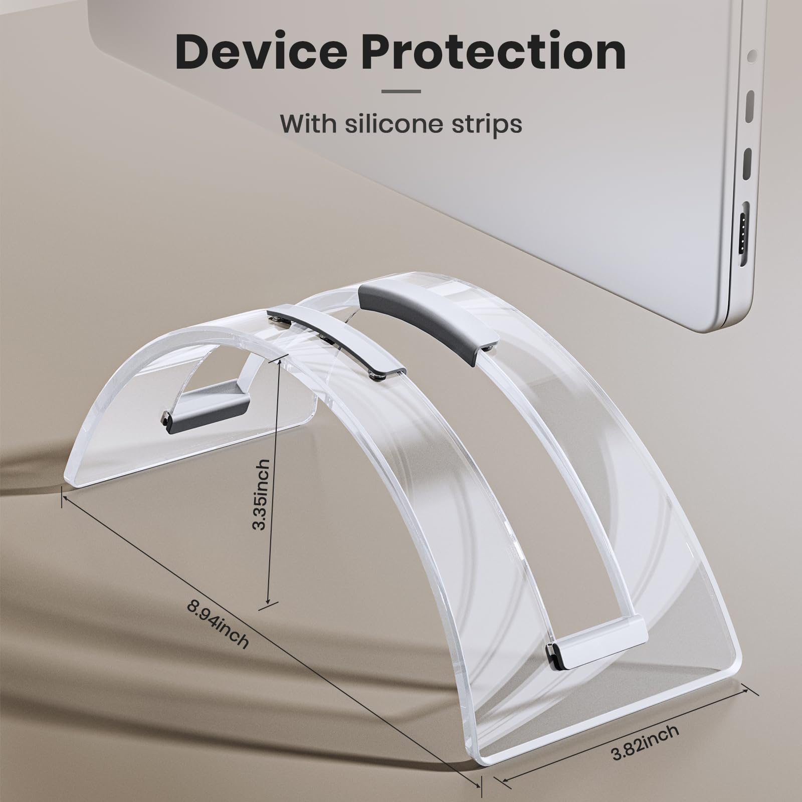 • 【Sleek and Stylish Acrylic Craft】Constructed from clear premium acrylic material, the laptop vertical stand comes with a sleek, minimalist design that is both functional and space-saving while adding a unique look and feel to the desk setup. Its clear arched design does not obstruct visibility and complements electronic devices of different colors, offering great value for the price.