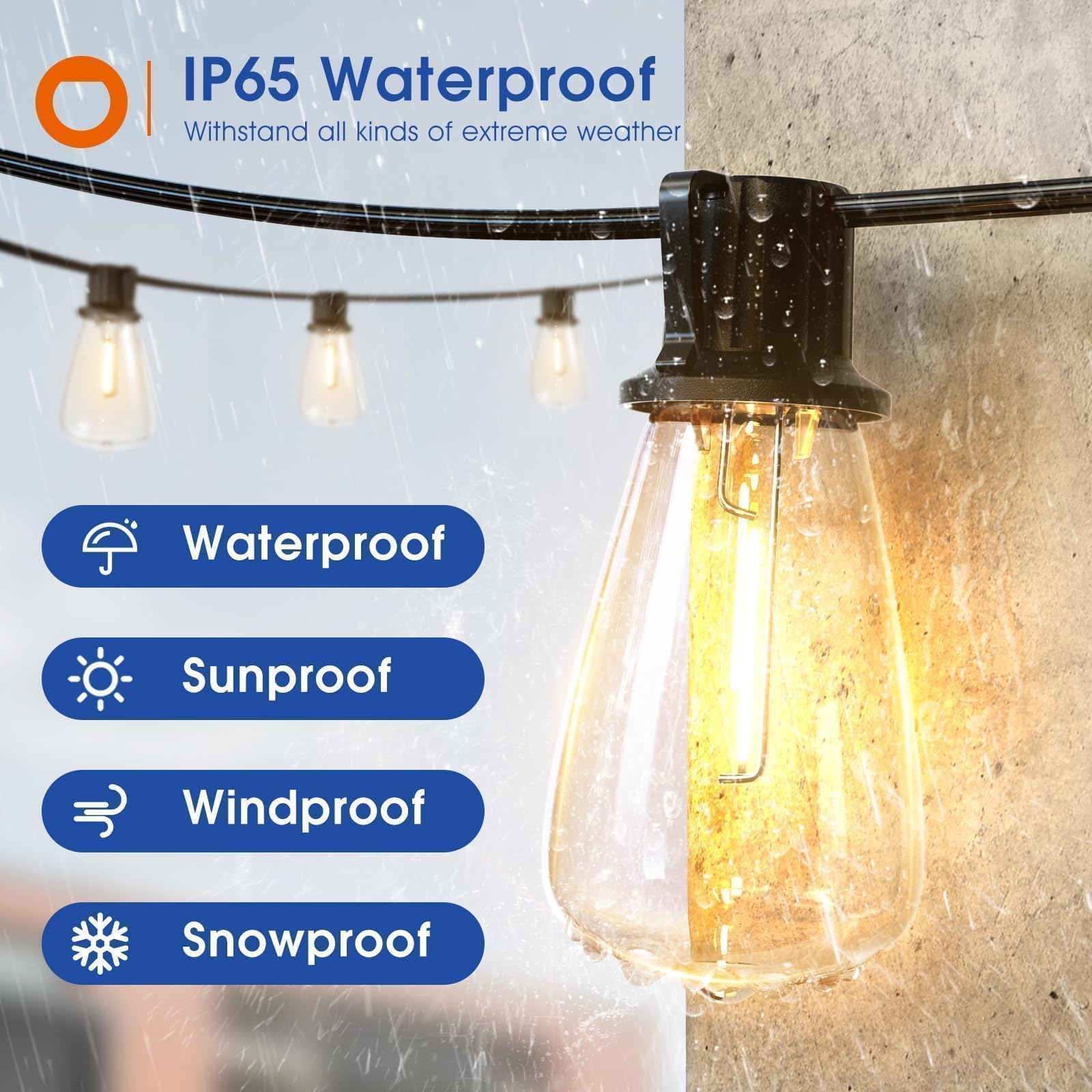 • 【Light up outdoors, rain or shine】Our ETL-certified, IP65 string lights stand tough against weather. Shatterproof PET bulbs of the patio lights ensure safety – no glass, just durable plastic. Efficient & lasting glow