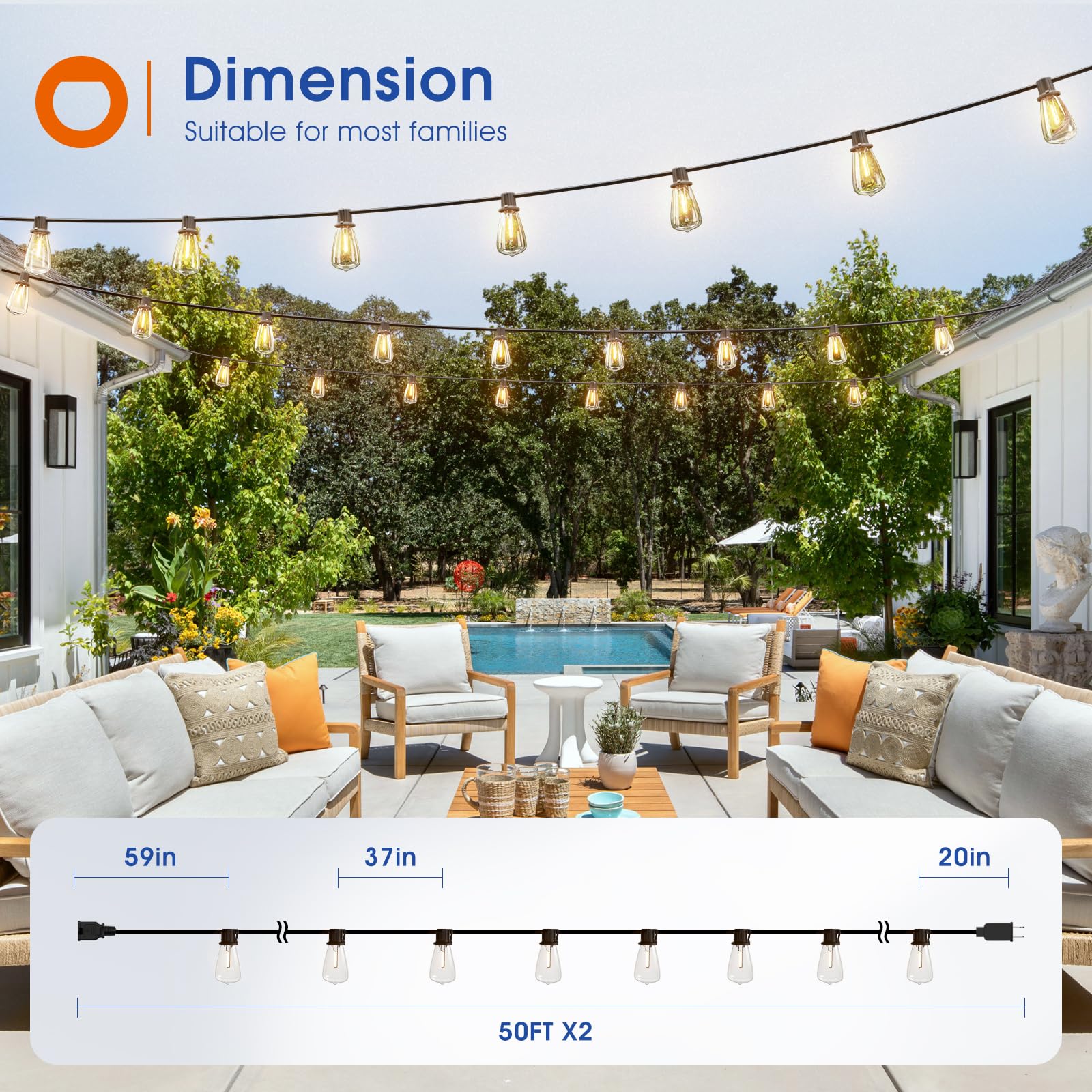 • 【Extend Your Ambiance 】 100FT (2x50FT) patio lights connect end-to-end. Link up to 28 strands of 50FT string lights for large-scale glow , no frequent length swaps. This is ideal for patios, backyards, bistros, gardens, gazebos, weddings, birthdays & more. Transform any occasion into a dazzling escape