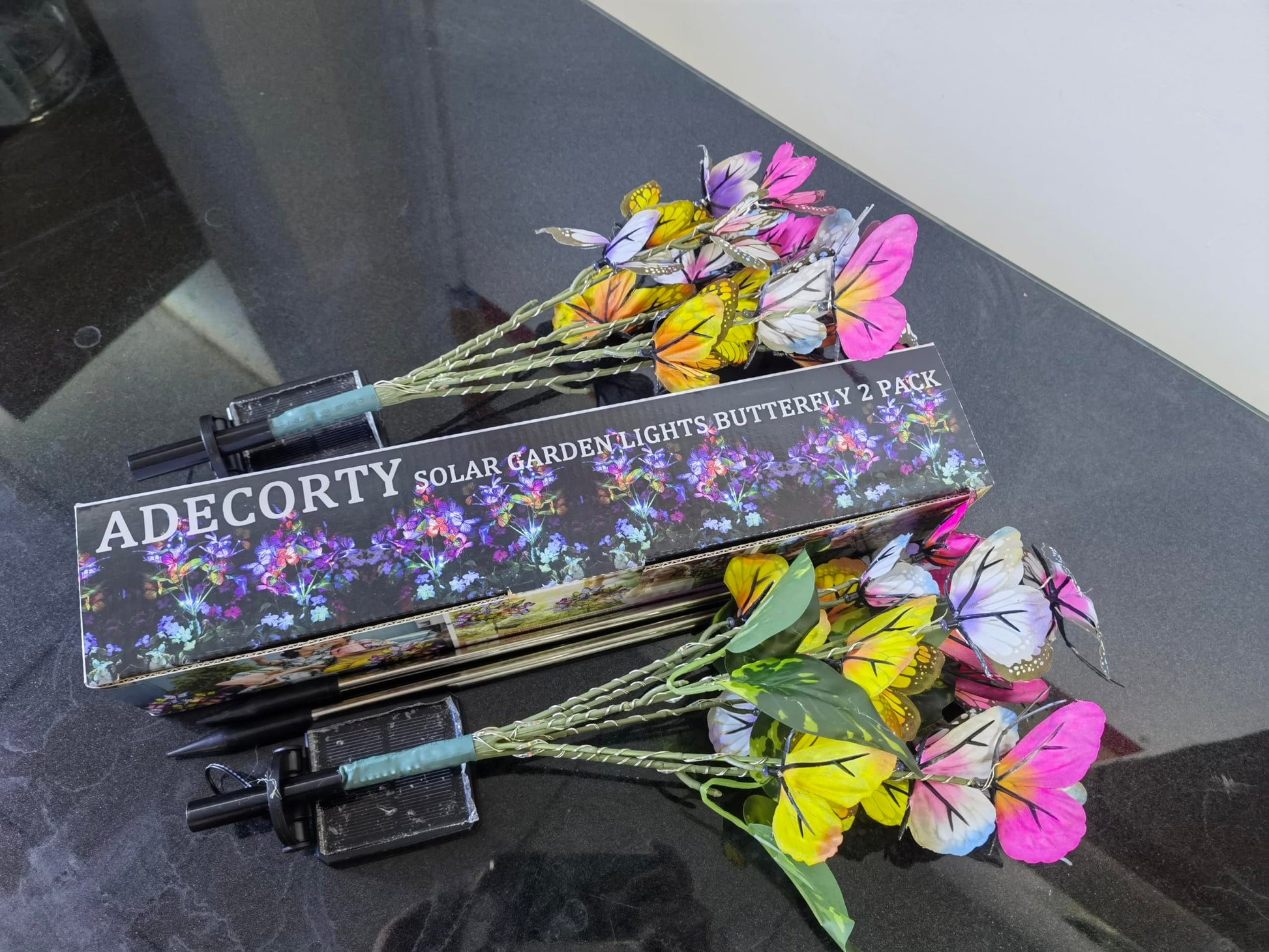 • 【NEW UPGRADED UNIQUE BUTTERFLY SOLAR GARDEN STAKE LIGHTS】2 Pack Solar Garden Lights Outdoor are composed of 34 lifelike butterflies and 44 multi-color LEDs fairy string lights. The Butterflies are made of high quality fabric and exquisitely designed to imitate real butterflies, adding lots of vitality for your garden or yard.