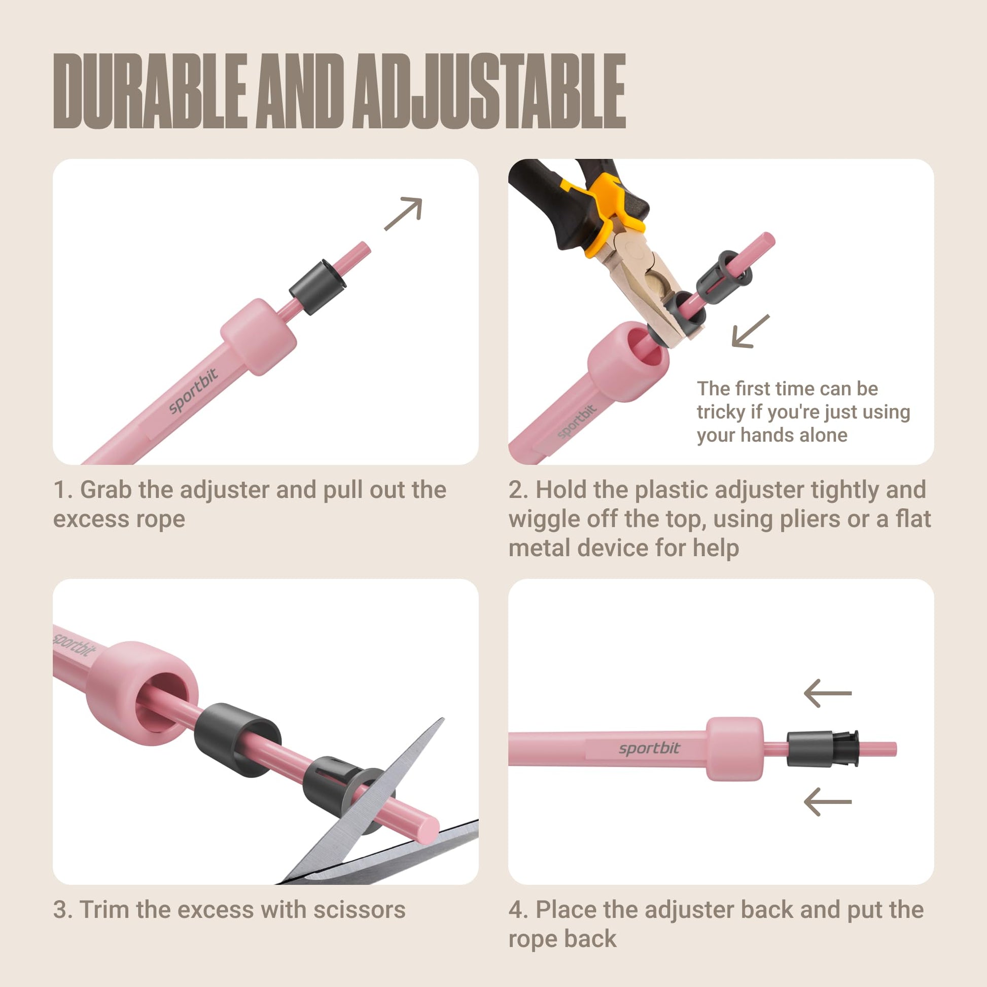 • ADJUSTABLE: The SPORTBIT jump rope for fitness is easy to cut and customize. You can even use kitchen scissors when adjusting the size of your skipping rope. This jump rope for men, women, and is 118 inches long, so it’ll work for any height! Plus, no internal wires or metallic parts guarantees you safety and ease of use.