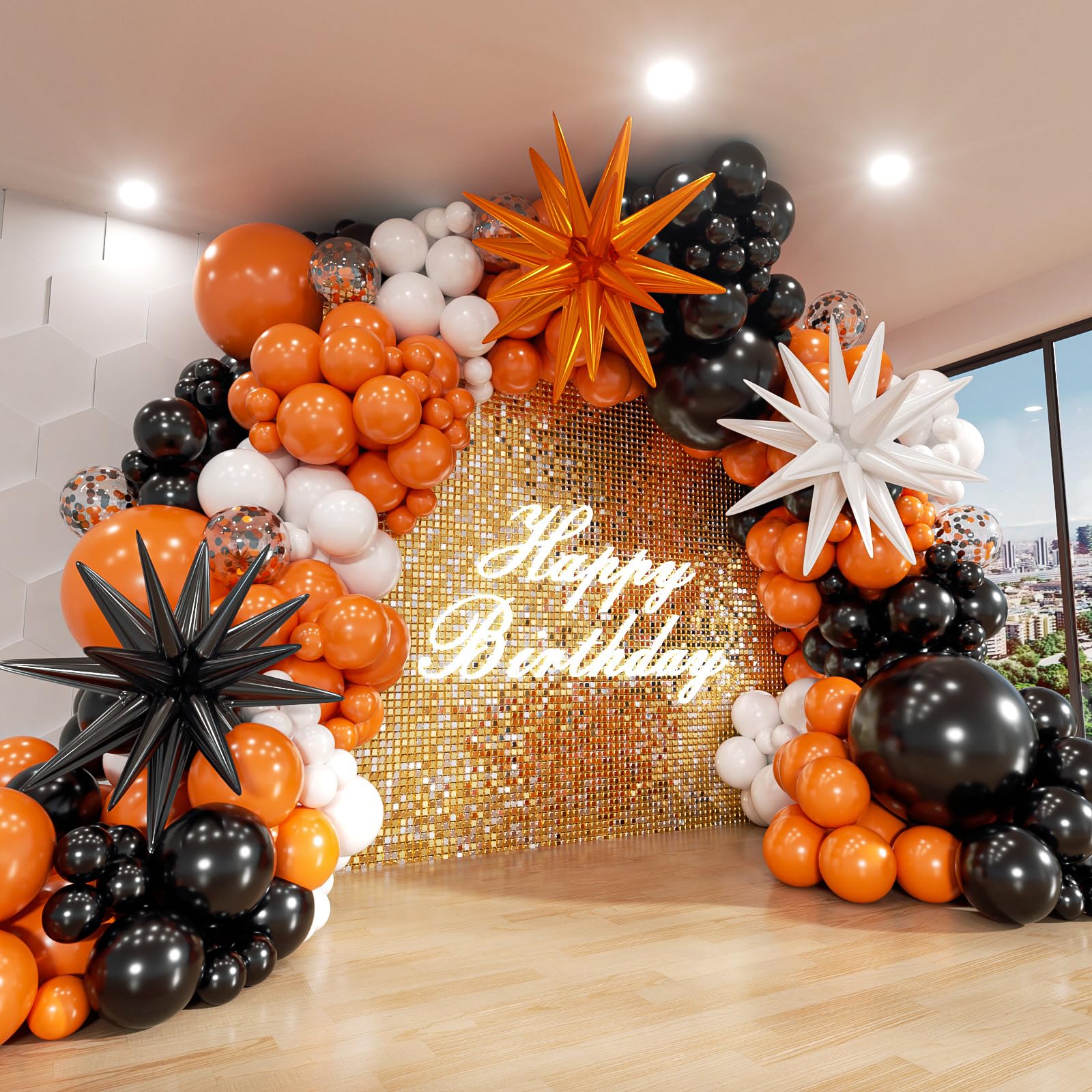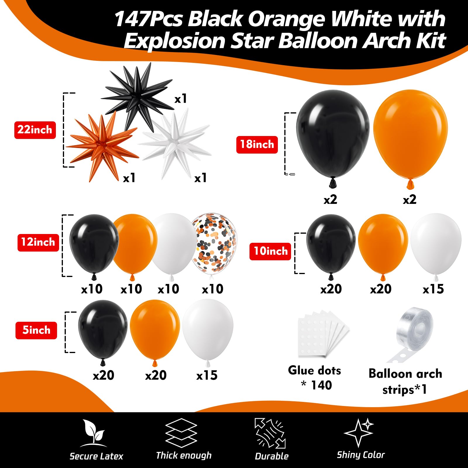 • 【Black and Orange White Balloon Garland Arch Kit】:Include 22“(Black explosion star balloons 1, Orange explosion star balloons 1, White explosino star balloons 1), 18''(Black balloons 2, Orange balloons 2),12''(Black balloons 10, Orange balloons 10, White balloons 10, Confetti balloons 10), 10''(Black balloons 20, Orange balloons 20,White balloons 15),5''(Black balloons 20, Orange balloons 20,White balloons 15),16FT garland strip x1,140 dots glue