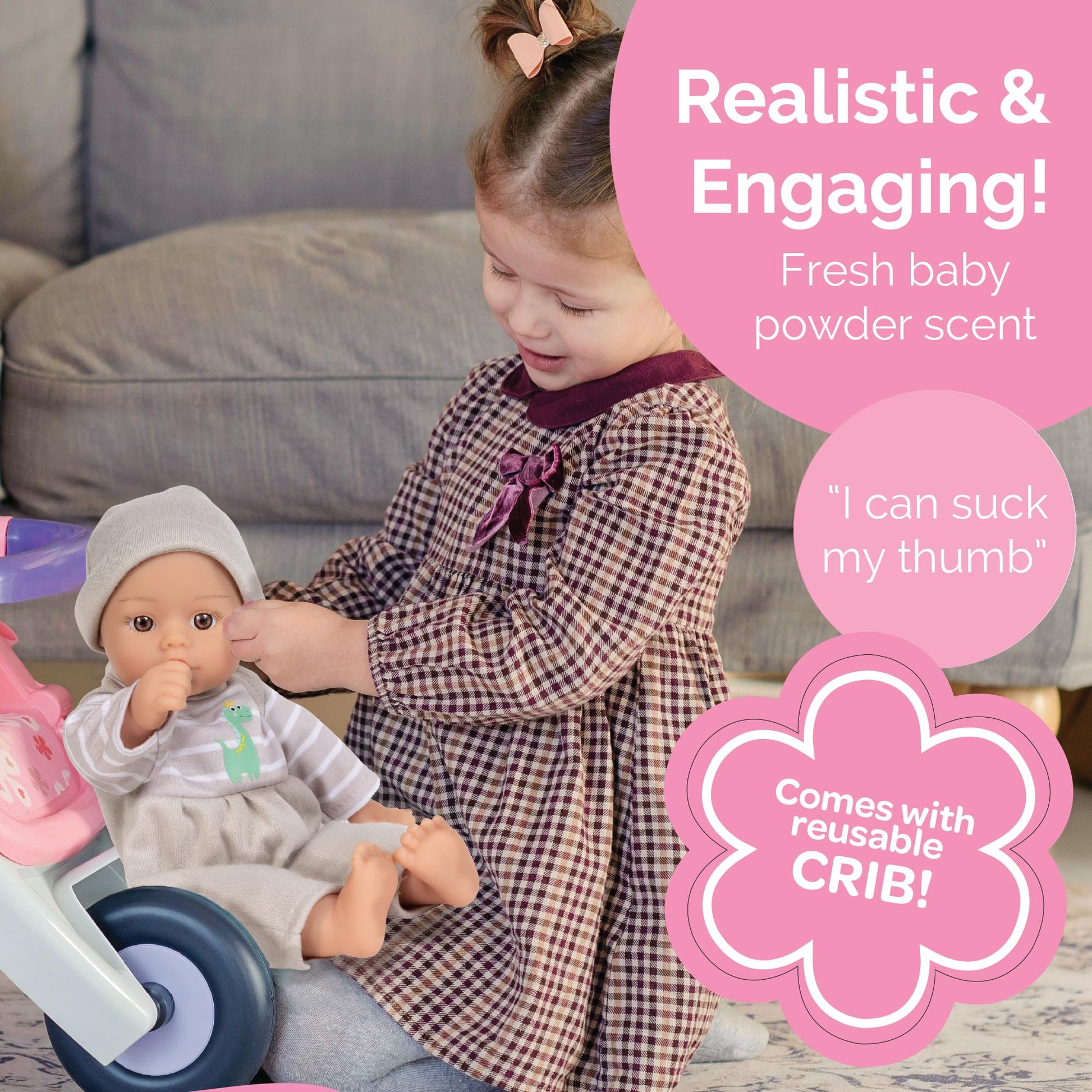 • Soft & Easy to Hold: This 11” baby doll has a lightweight cloth body that’s comfortable to carry and built for durability. Its flexible design allows for easy positioning, making it great for interactive play, rest time, or travel without feeling bulky or hard to manage