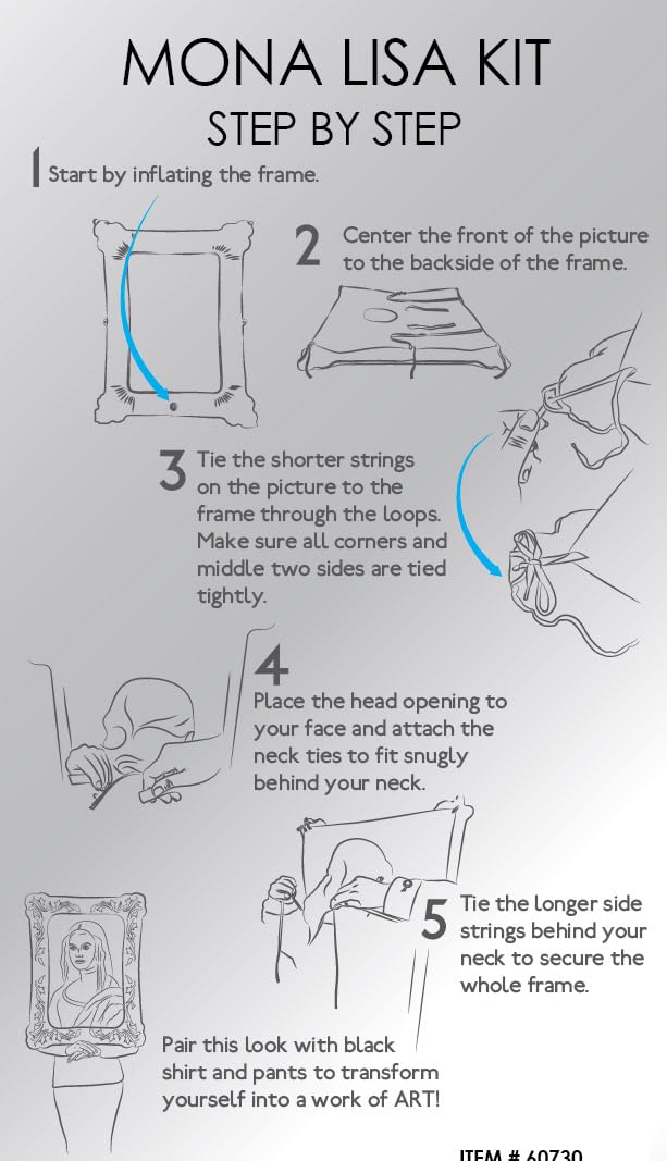 The Masterpiece Speaks What was Mona Lisa thinking while DiVinci was painting her expression in oils? Was she wondering if her sister would be mad that Mona borrowed her best dress to get her portrait done? Perhaps she was plotting on her come back when her sister saw the finished product and finally realized why the gown had been missing every single Tuesday for a month. Or maybe her secret mirth was directed at the painter himself. Did DiVinci have a streak of brown paint in the middle of his face from when he itched his nose? Was there a servant in the doorway making faces as she waited to serve lunch? The thing is, we'll never know what she was thinking. Unless that is, she comes back to tell us! Product Details Solve the mystery and let everyone know what the mysterious Mona was thinking of by dressing up as her legendary portrait. The light-weight inflatable frame will make being framed more comfortable than ever while the portrait inside the frame leaves a hole to put your face through. Renaissance Woman This costume can be worn again and again. It's a great pick for art teachers who want to have a little fun with their class as well as folks who want to show up to their local Rennaisance Faire in style! Hey, you could even pair up with Leonardo. You're the masterpiece, you get to decide! - Frame - Picture