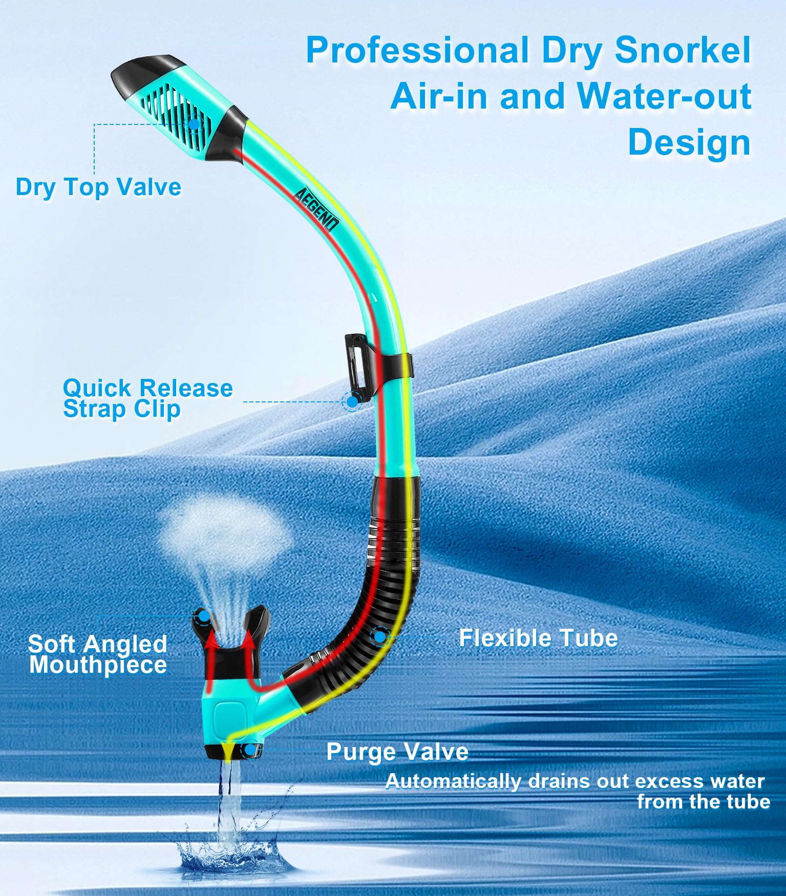 • DETACHABLE DRY SNORKEL- The snorkeling gear comes with a detachable snorkel. Easily blow out water through one way purge valve. It sits at the bottom of a bulblike reservoir that is off from the mouthpiece tube, which makes it effortless to clear. You can even remove water from the snorkel while underwater, all you do is give it a good blow.