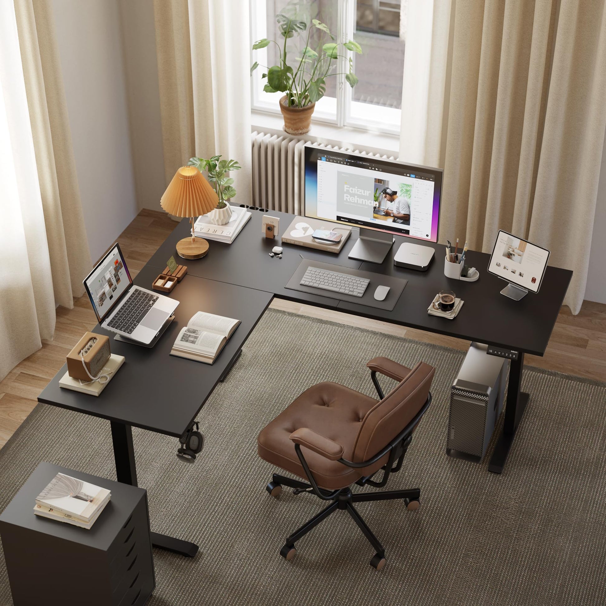 • 「63' Ample Workspace」63*55' L-shaped adjustable height desk is perfect for home office and gaming by providing large space. Extra-large space easily holds 3 desktop PCs, 1 laptop, and other office accessories.