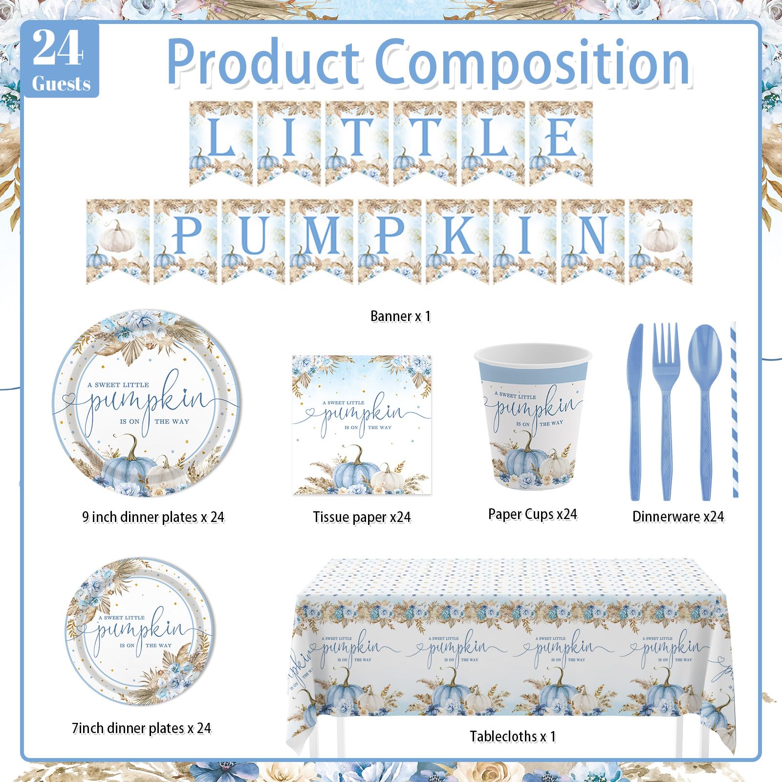 • Package include: Our pumpkin baby shower party decoration kit set Includes 1X little pumpkin banner, 24 X 9” a little pumpkin is on the way paper plates, 24 X 7” little pumpkin plates, 24 X pumpkin cups, 24X 7” paper napkins, 24 plastic forks, 24 plastic knives, 24 straws, 24 plastic spoons,1 tablecloth(9 X 4.5ft). there are a total of 194 pieces in this set, which can serve 24 guest at the same time, nice combination to satisfy your fall and baby shower theme party needs