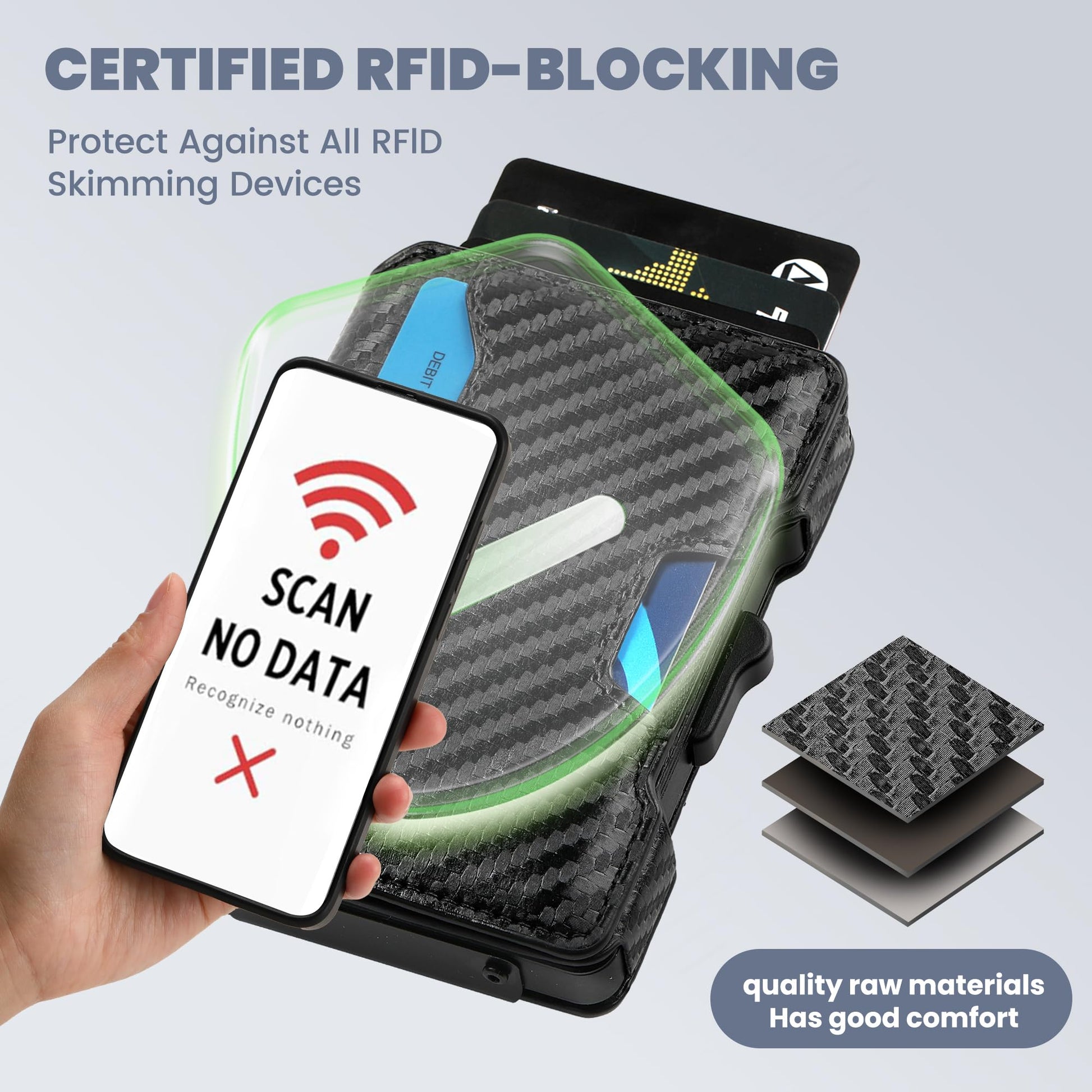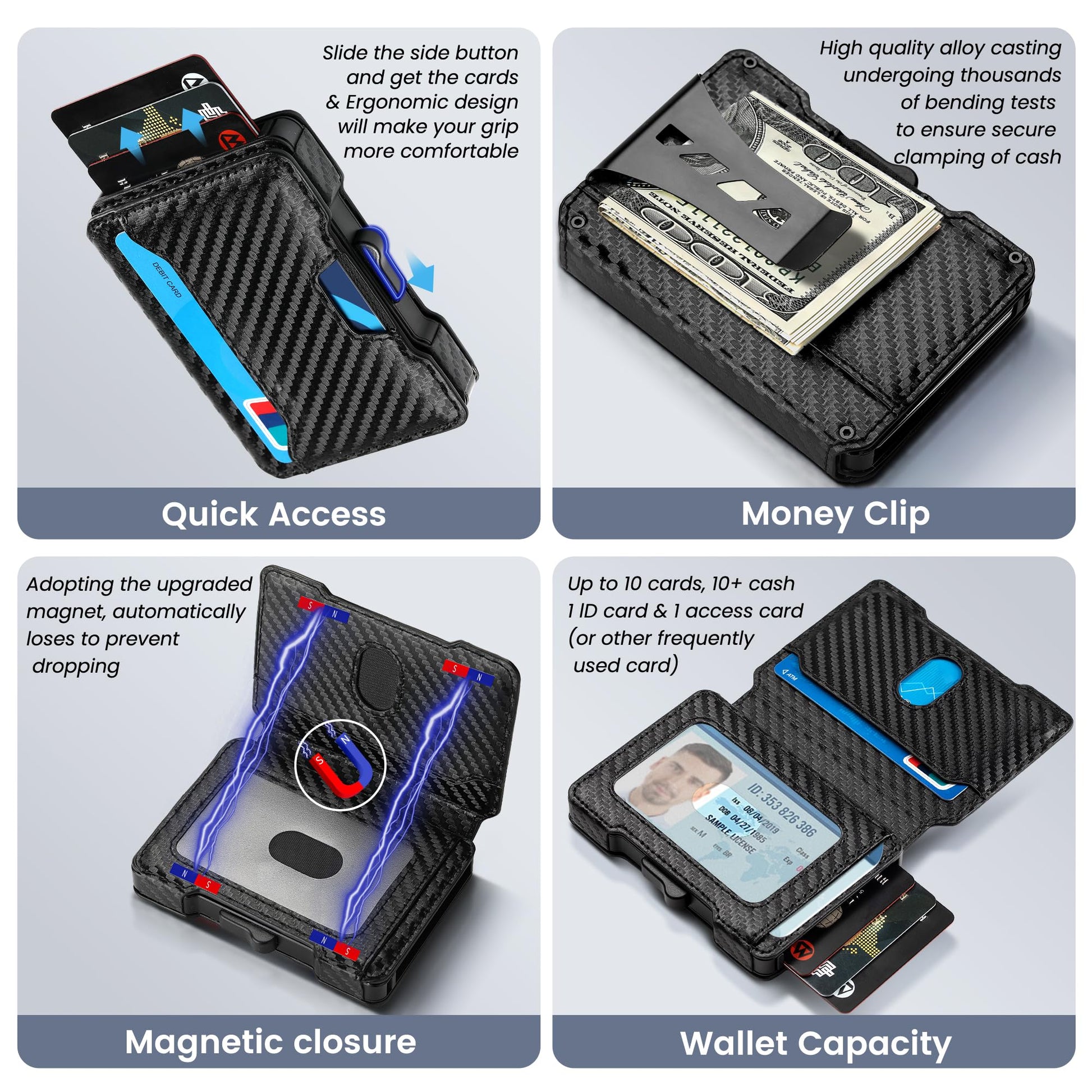 • [MILITARY-GRADE MATERIALS]: Crafted from waterproof leather and carbon fiber shell, our wallet exudes both elegance and durability. The aluminum alloy pop-up case keeps your cards protected without adding bulk, while the reinforced button undergoes thousands of presses to guarantee top-notch quality. This is one tough wallet that's ready for any adventure!