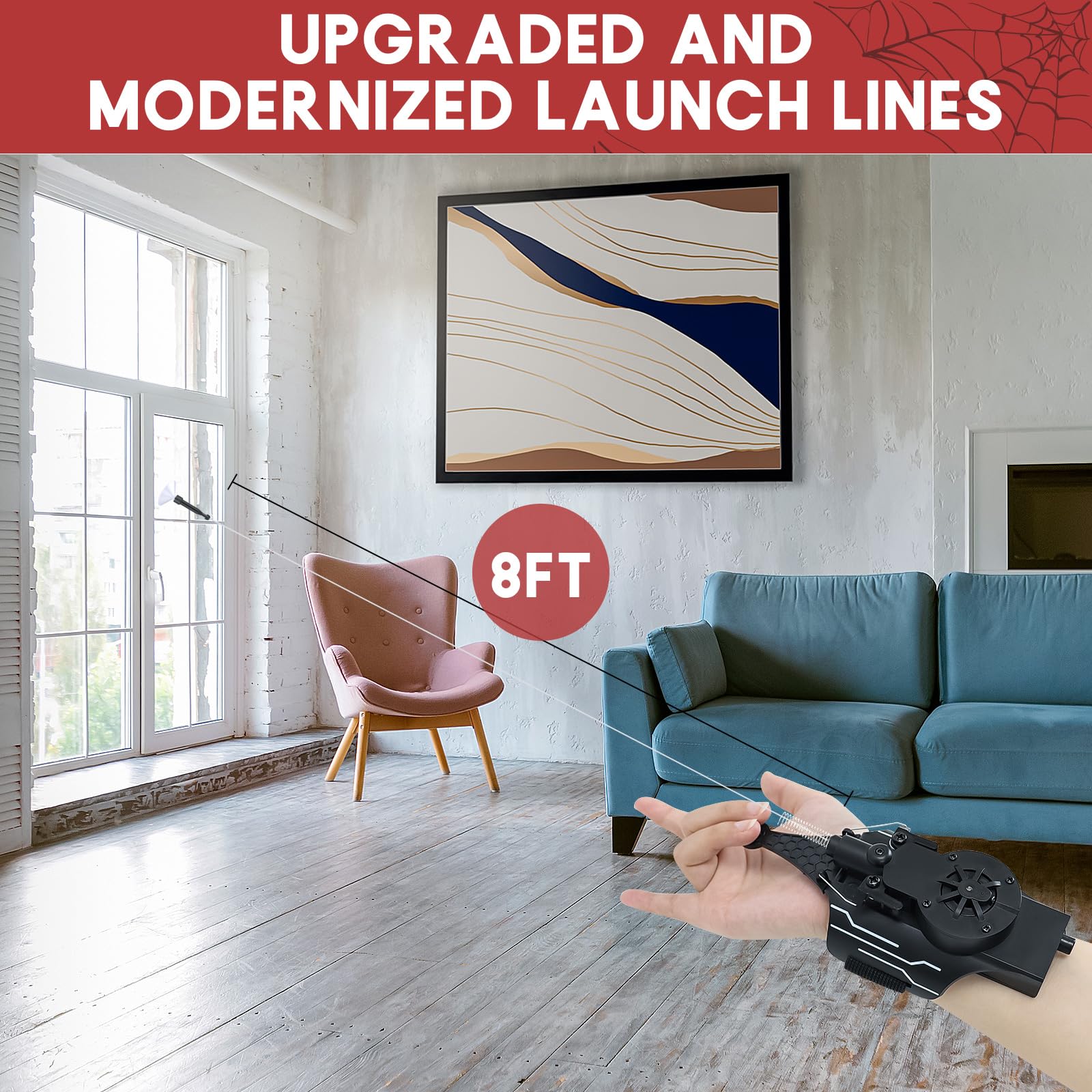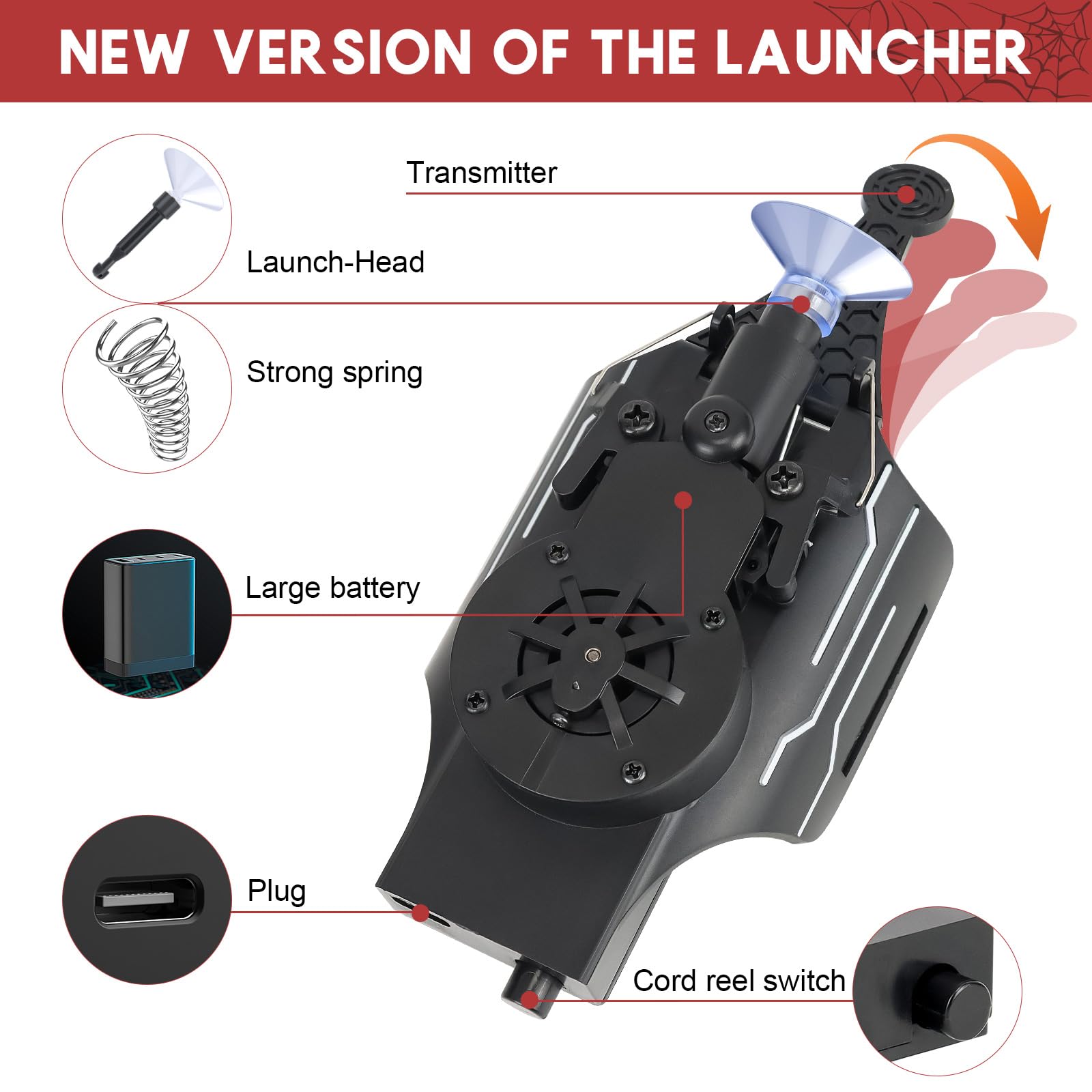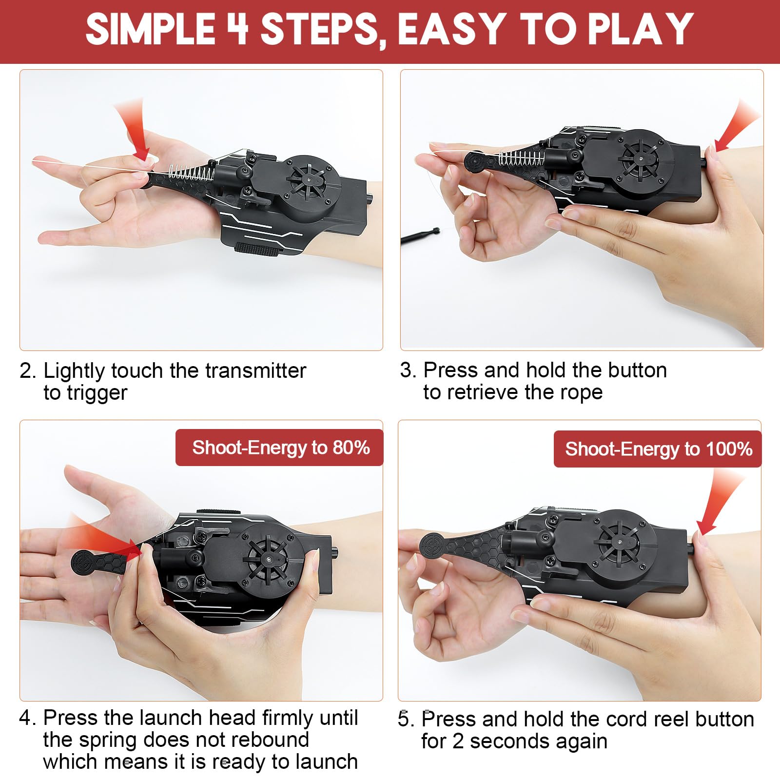 • 【Easy to operate】: real spider web shooter built-in rechargeable battery and motor, just gently press the reel-in switch for about 4 seconds. Then press the spring for the next launch. Launch effective distance: 8ft.