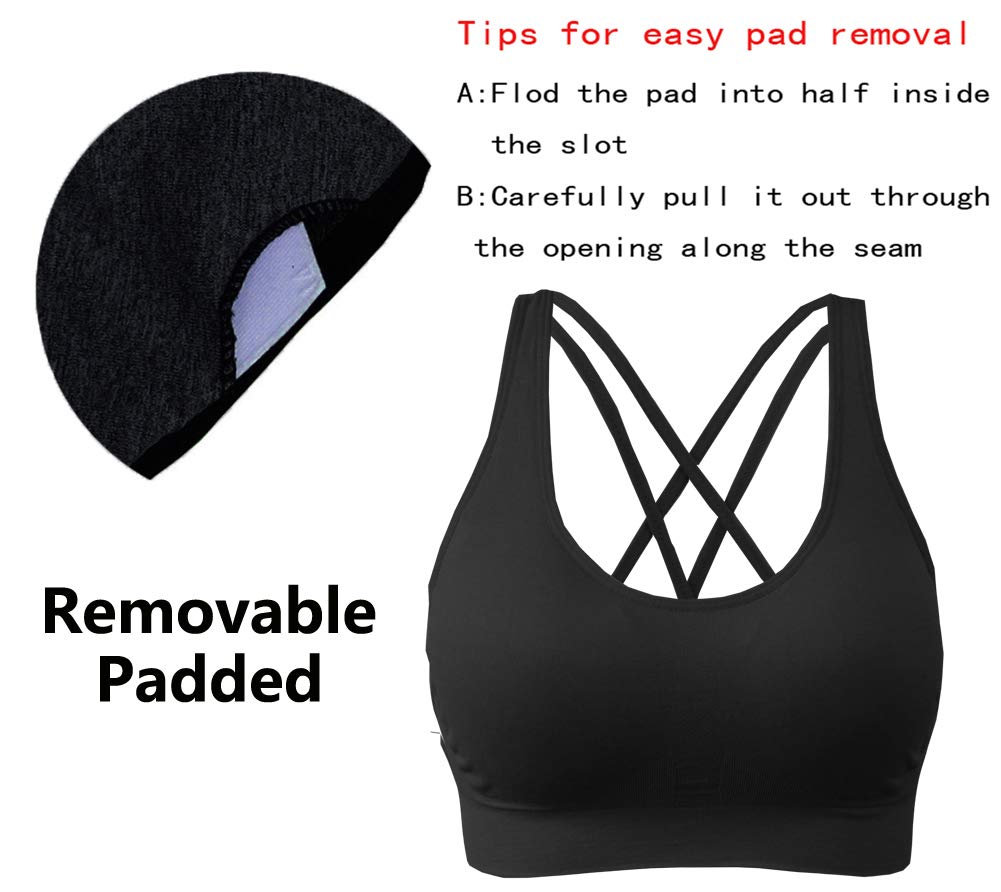 AKAMC Women's Medium Support Cross Back Wirefree Removable Cups Yoga Sport Bras, Pack of 3, Black/White/Grey,X-Large