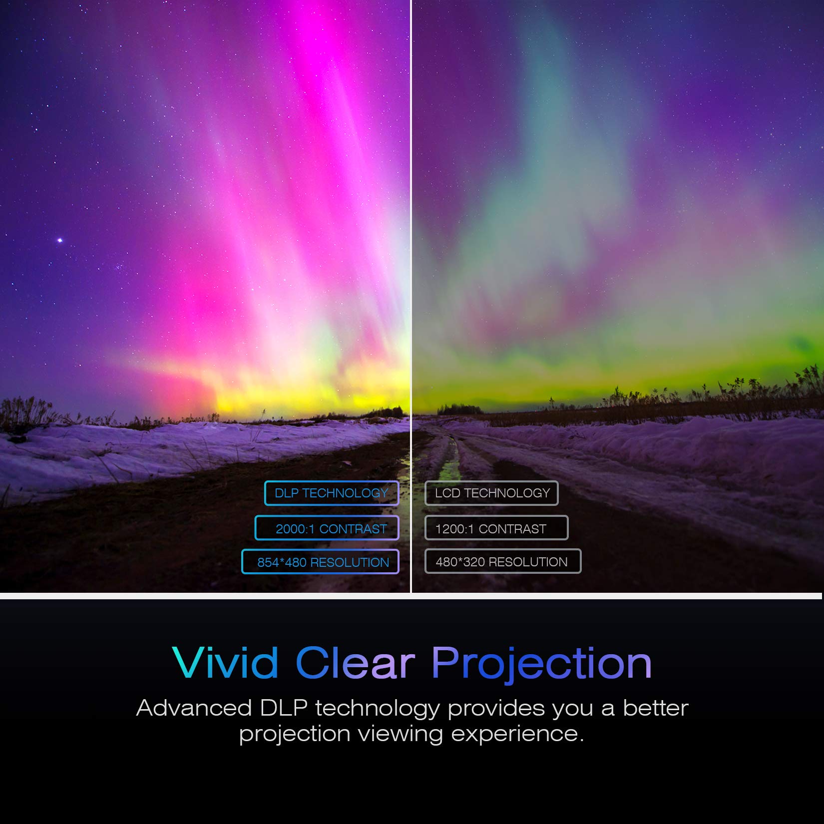 • Easy Portability Design Mini Projector: Compact and light weight design portable DLP projector built-in rechargeable battery and speaker. Powers via rechargeable battery up to 2.5 Hrs. Come with remote control and tripod, free of keep taking projector off the stand every time you need to turn it on/off or select something on the menu. Ideal for outside activities like small meetings/ gatherings or gaming time.