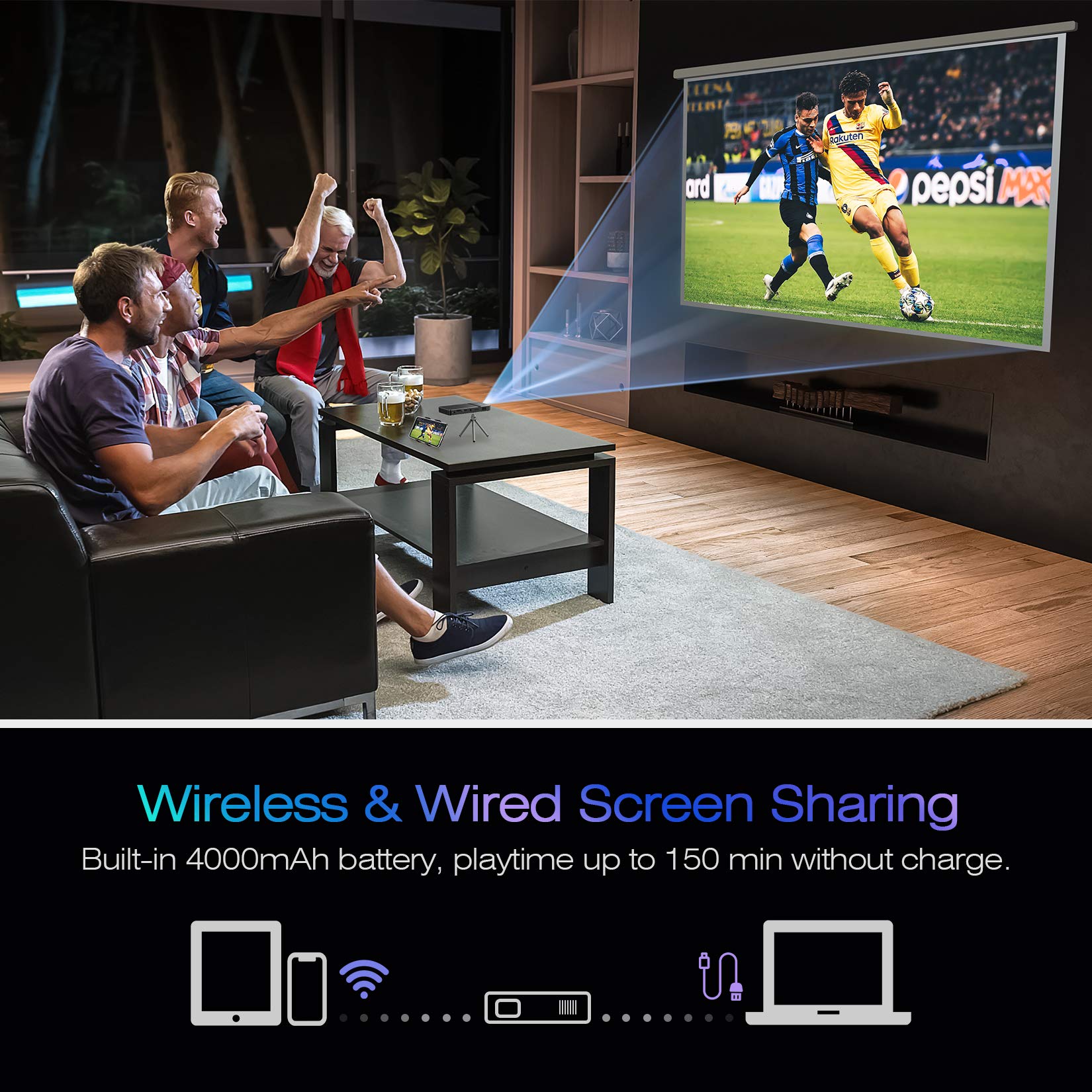 • Multiple Wired & Wireless Connectivity Methods: Pico projector built-in Micro USB/USB/HDMI/AV/Micro SD port and come with HDMI & Micro USB cables, easy to hookup to camera, storage drive, PC, Laptop & other compatible devices. Also support wireless mirroring between mobile to projector via Airplay or EZCast.