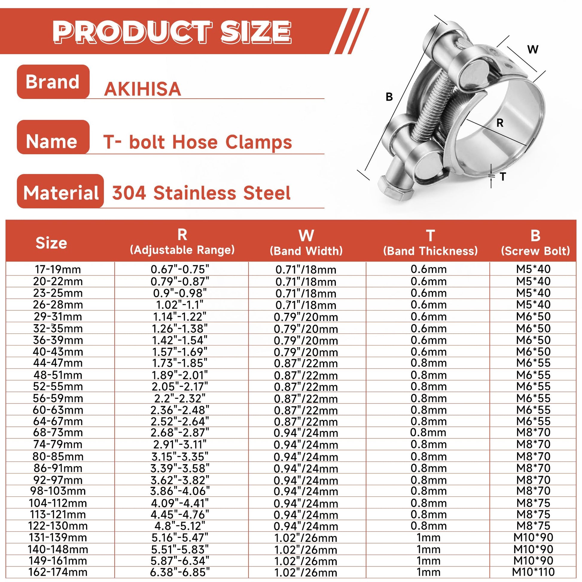 • 🪐【Clamps Size】---T bolt clamp adjustable Work Range: 17-19mm (0.67'-0.75' ); Width: 18mm (0.7'); Thickness: 0.6mm (0.024'); The screw bolt size: M6*40mm. To save you time, please check carefully and measure your hose OD to fit T bolt clamp working range before purchasing our products.