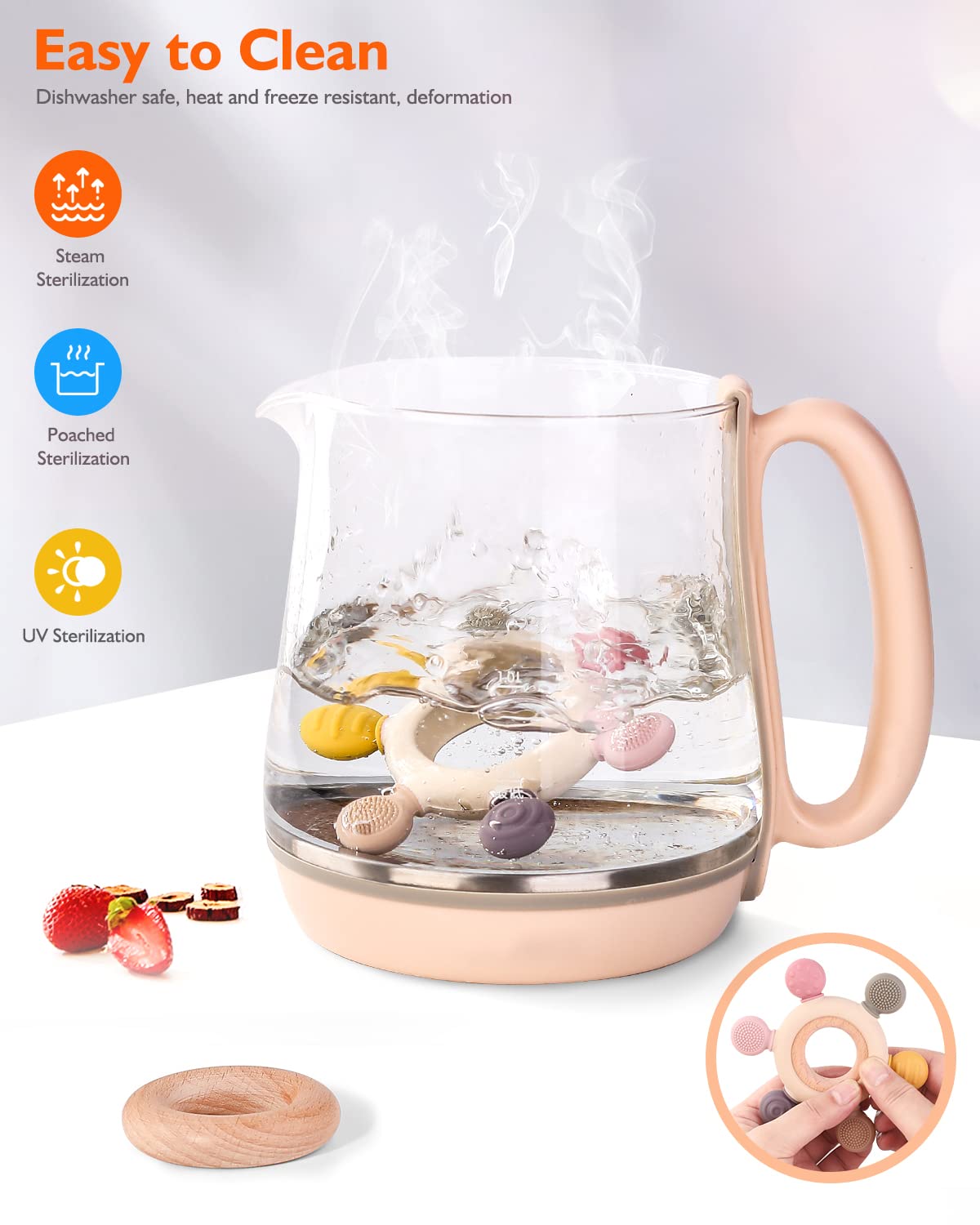 • EASY TO CLEAN: Our teething toys are easy to clean, simply wash with mild soapy water or boil to sterilize. Teething toys can also be stored in the fridge for extra cooling.(Note: the wooden ring can't be boiled, please remove it)