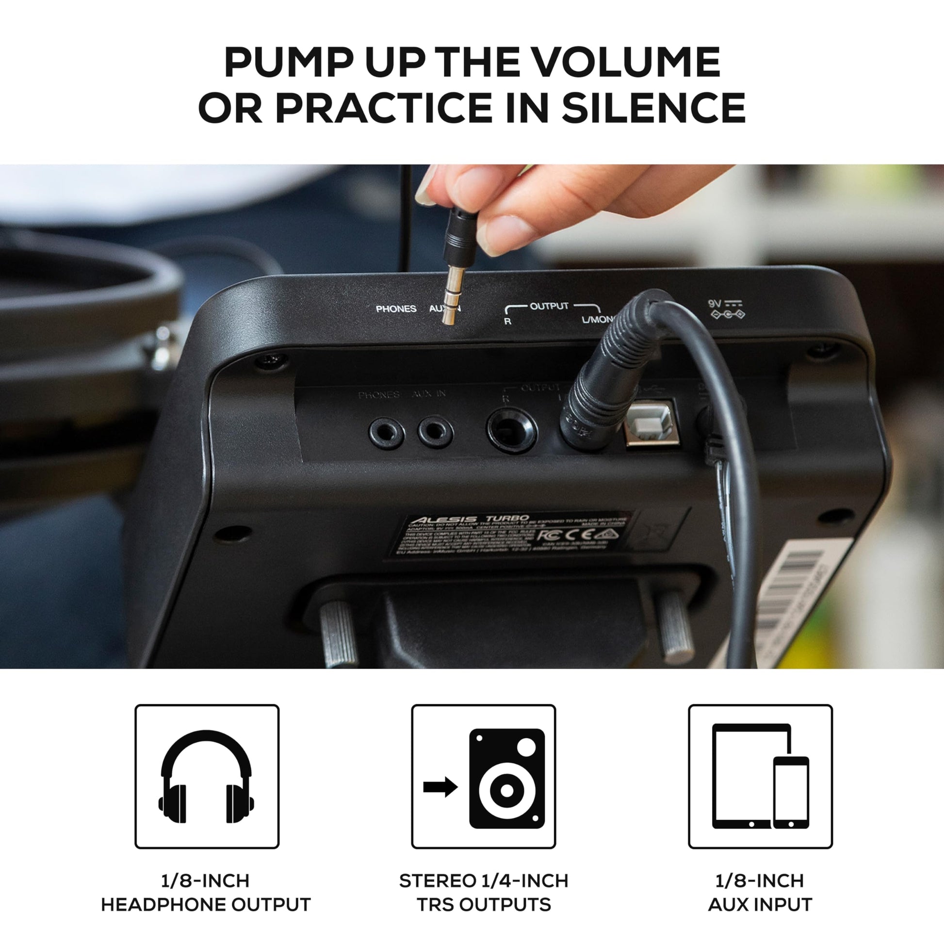 Right out-the-box, the Turbo Mesh Kit guarantees to get you playing fast, including cabling, drum key, even drumsticks! With Turbo Mesh’s USB-MIDI port, transmit MIDI information directly to a computer and unite your synthesizer, drum machines and more for expanded performance potential, plus, utilize the Turbo Mesh Kit’s handy headphone output for ultra-quiet practice.