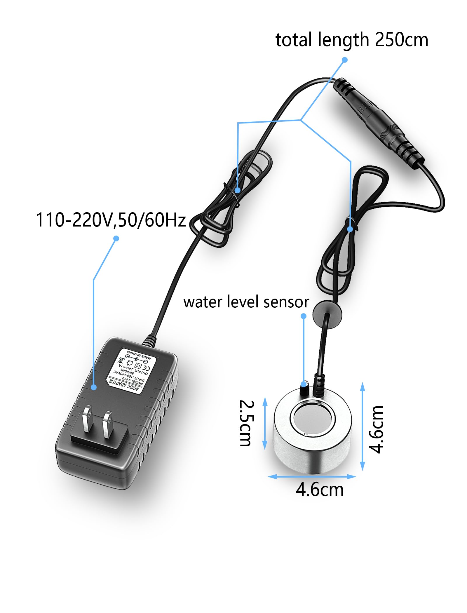 • 【Correct usage method】:Ensure that the water surface is above the water level sensor. The maximum mist volume occurs when the water surface is 2-3cm above the atomizer. The maximum continuous working hours are 10 hours, and it's better to arrange a one hour break for the fogger. Please disconnect the power and place it in a dry place when not in use.