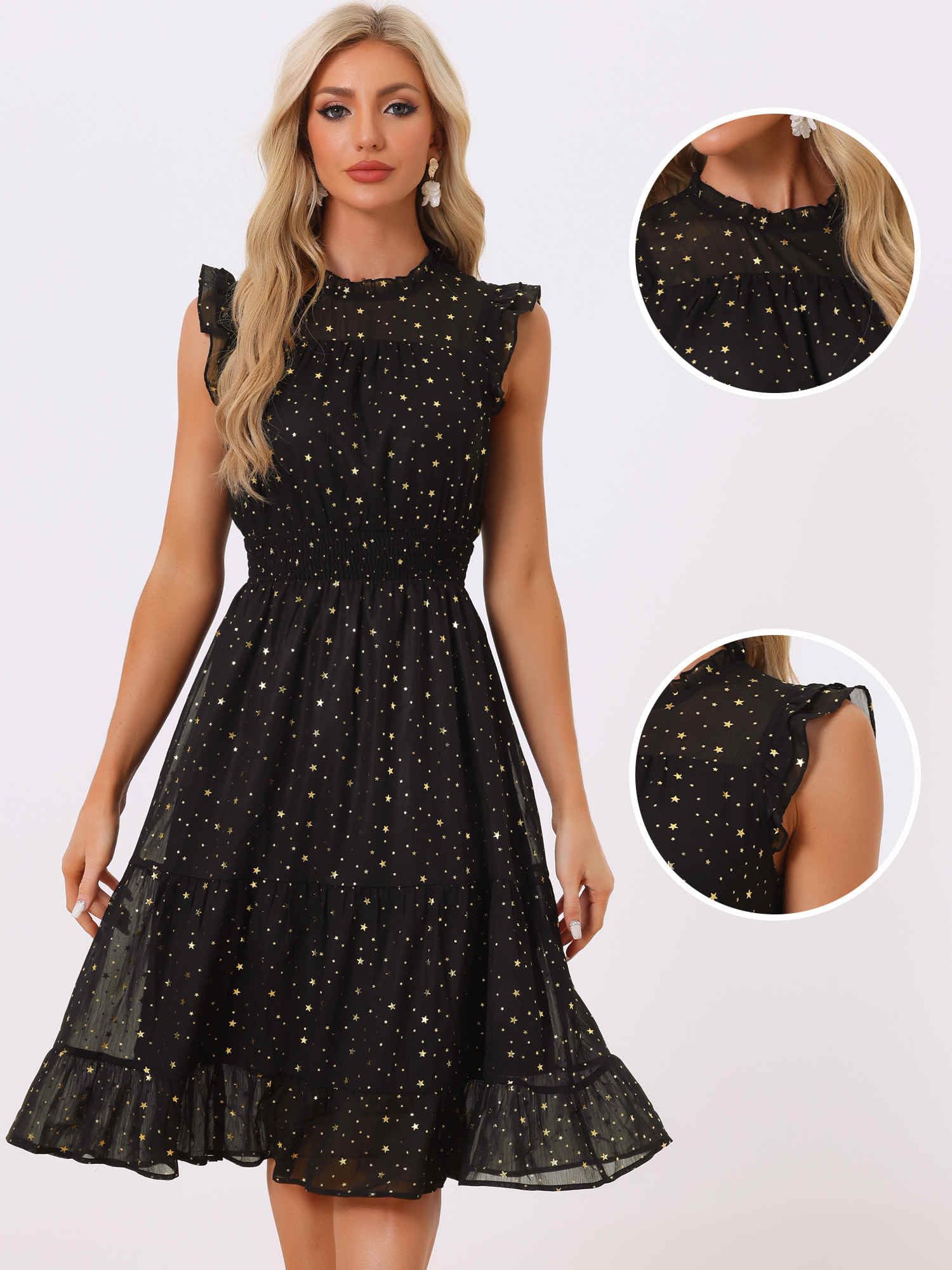 • This smocked midi dress is made up of several design points: metallic stars, smocked waist, chiffon fabric, sleeveless, lined, Fit and Flare midi dress for women, semi formal dresses for women