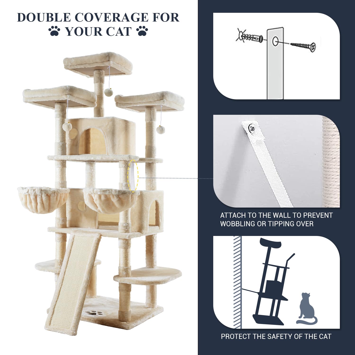 Allewie 68 Inches Cat Tree/House and Towers for Big Feline/Scratching Post/Multi-Level Large Kitty Climbing Tree with Condo/Beige