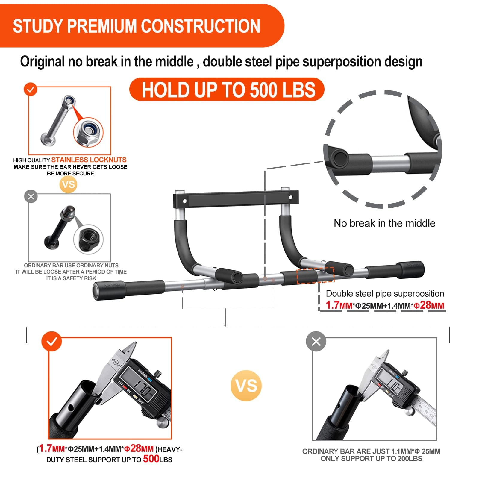 • HEAVY DUTY CONSTRUCTION,HOLD UP TO 500 LBS: The pullup bar make from 1.7mm thickened chrome steel.Original no break in the middle , double steel pipe superposition construction.These features permit the 500lb weight limit.High quality lock nuts help prevent loosening of the assembly.The fine powder coating prevent rust and corrosion.High fiber foam handles provide a comfortable grip, anti-slip and wear resistance.