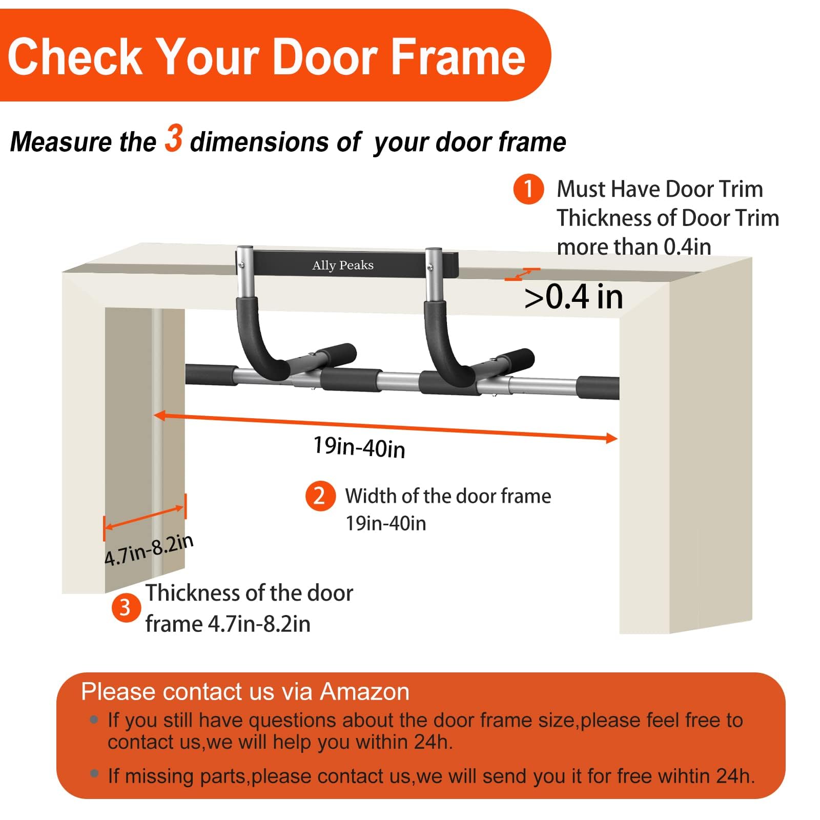 • UPDATED WIDTH ADJUSTABLE DOORWAY PULL UP BAR:Real adjustable width design can match your doorway more accurately, even doors in the corner. This door frame pull-up bar has 5 levels of adjustment for width and 2 levels of adjustment for thickness can be precisely mounted on any standard 21.65 '- 39.37' wide doorways,depth of 4.7'-8.27',Acceptable trim height up to 3.75',easy to install and remove. Design does not necessitate screwing into frame making the assembly easy to remove.
