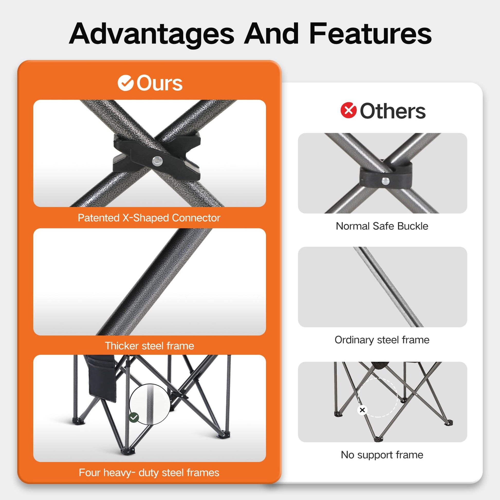 • 【Durable & Heavy Duty】ALPHA CAMP camping chair features 22mm thicker robust steel pipes, innovative X-shaped reinforcement, and four heavy-duty steel frames for excellent stability and weight capacity (up to 450 LBS). Thanks to the hammer tone powder coating, rust and scratches are prevented.