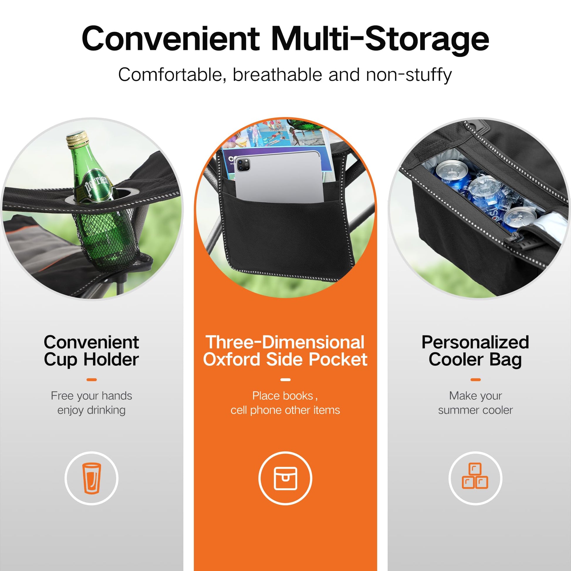 • 【Large Storage Space】This folding camping chair has all the storage you need. The cooler bag fits six 200ml cans. A mesh cup holder for your beverage. And a roomy side pocket for your phone, sunglasses, magazines, and other items.