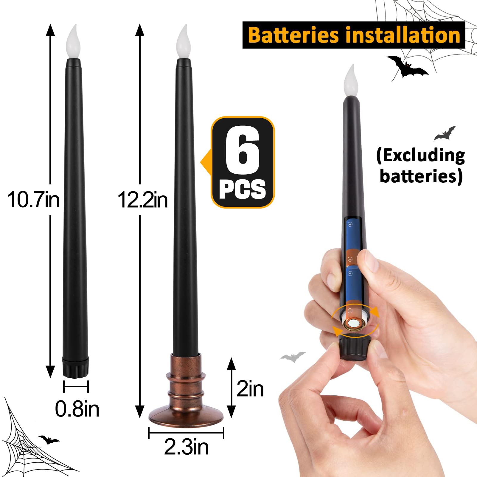 Alphatool 6 Packs Halloween Black LED Flameless Candles with Bases - Flicker Flame, Tall Taper Smokeless Dripless Candles, Decor for Fireplace Diningtable Bar School