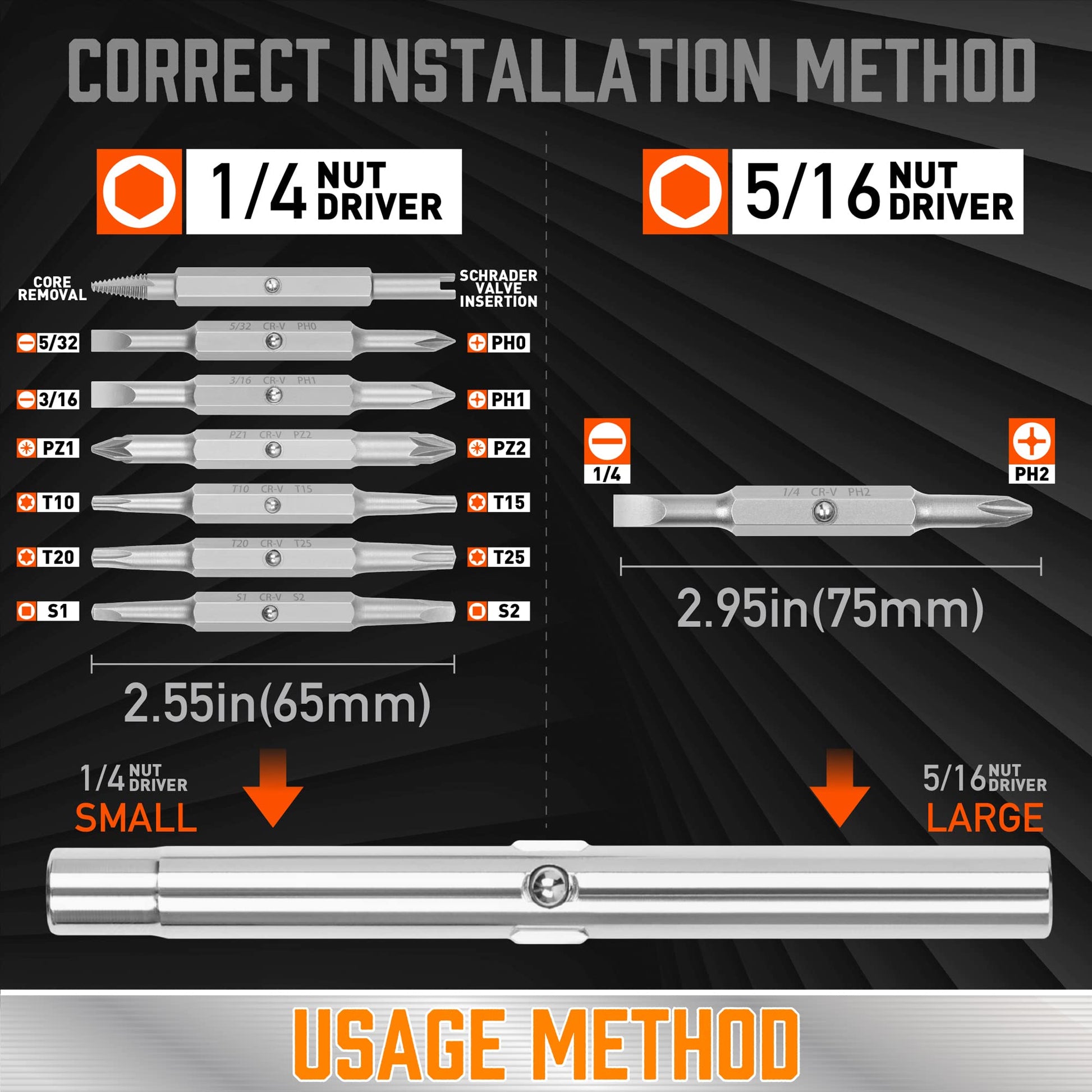 • [High-Quality]: Industrial strength heat treated bits, Phillips Bit:PH0 PH1 PH2, Pozidriv Bit:PZ1 PZ2, Torx bit:T10 T15 T20 T25, Square Bit:S1 S2, Slotted Bit:5/32' 3/16' 1/4', Nut Driver:1/4” 5/16”, Core removal and schrader valve insertion bit.