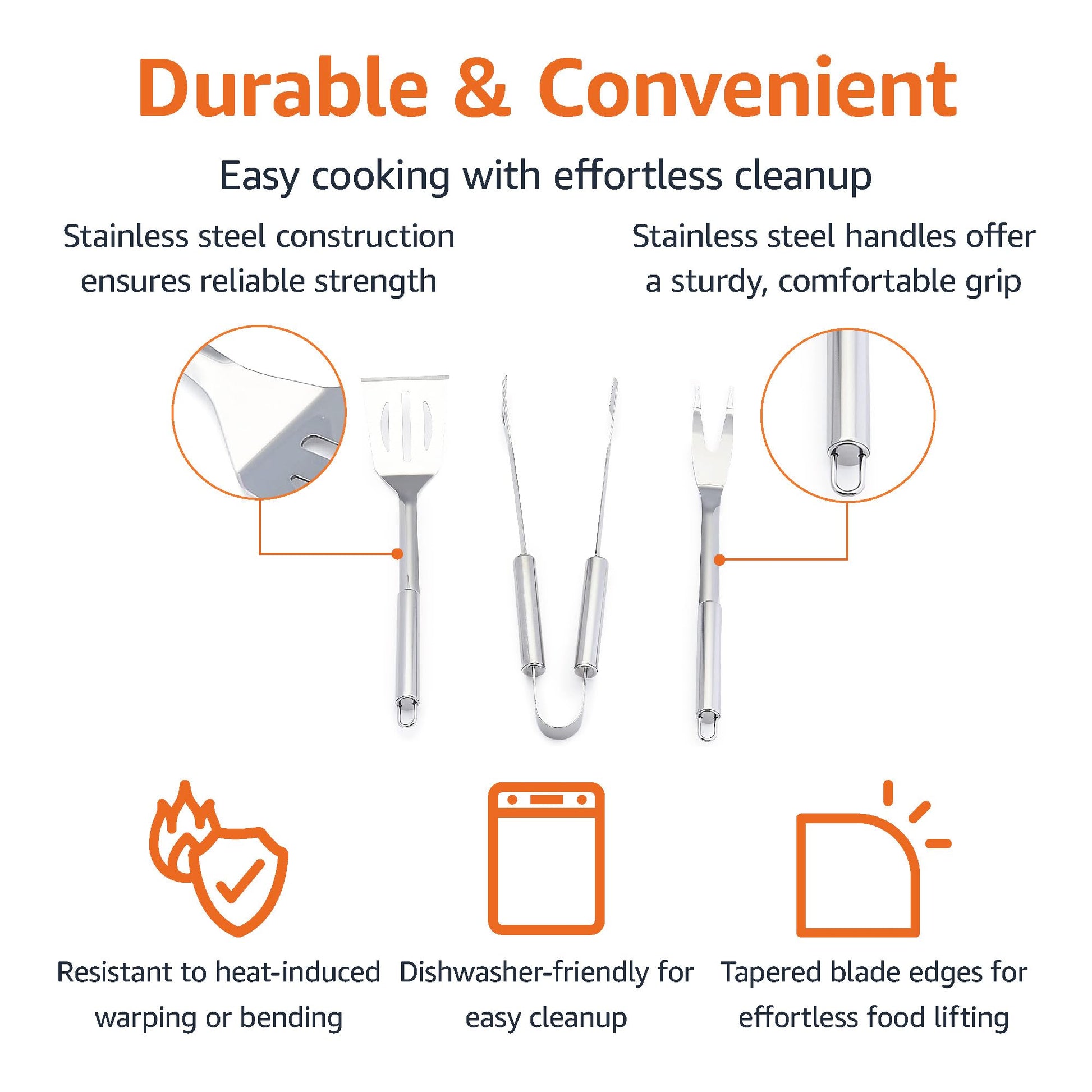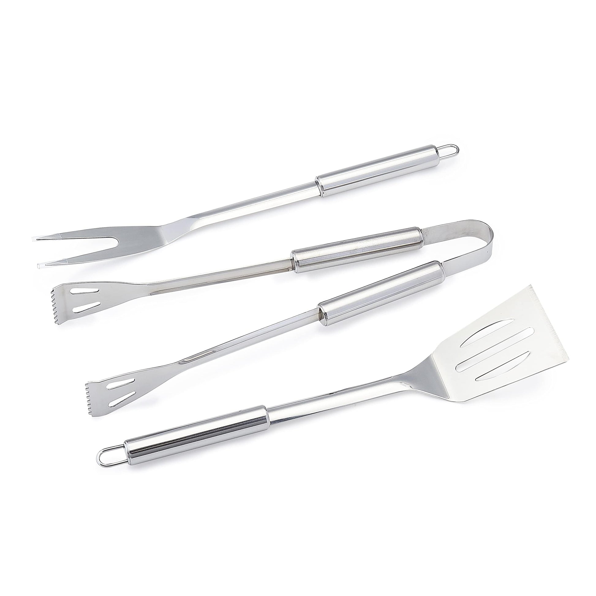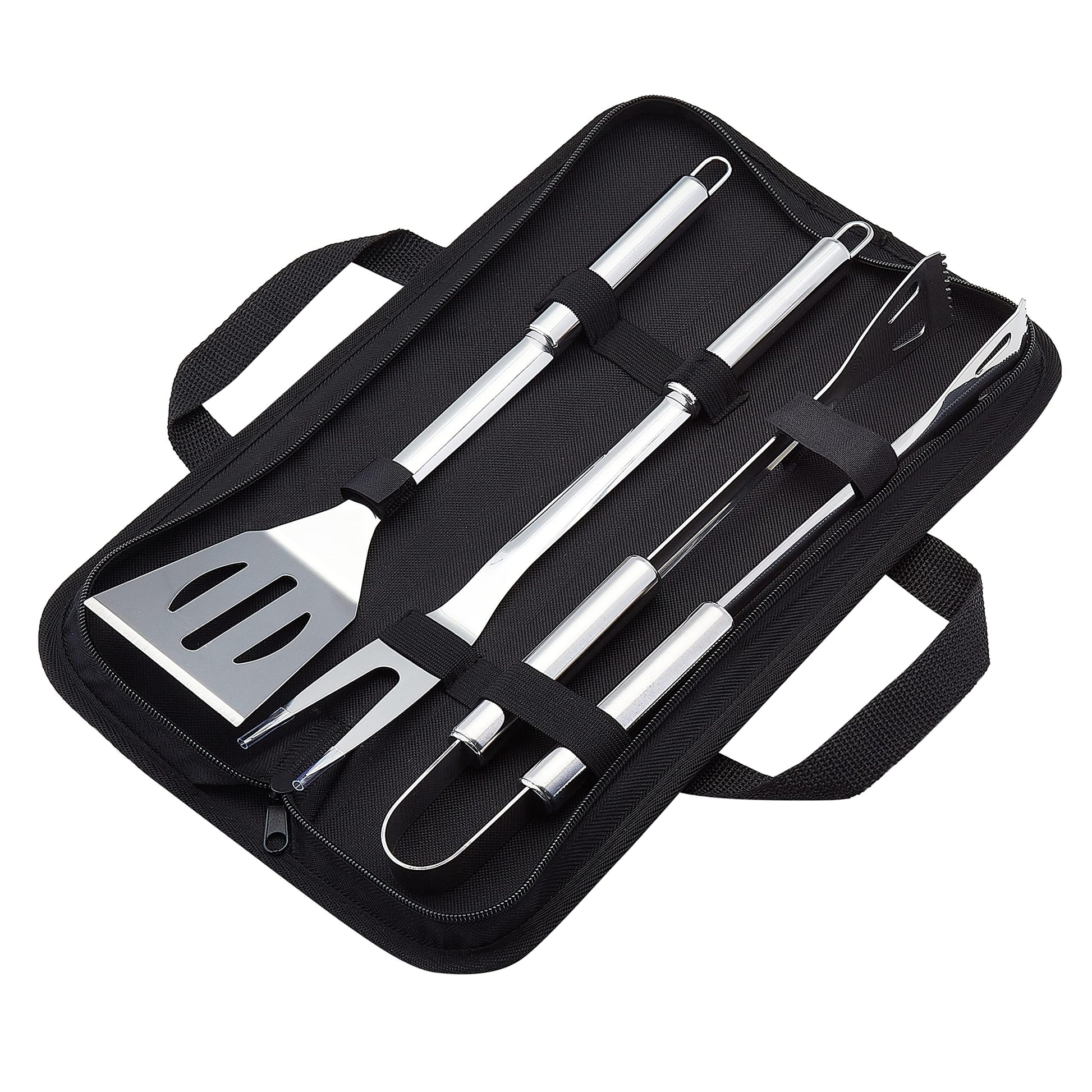 • Includes a spatula, a grill fork, a pair of tongs, and a cloth storage bag