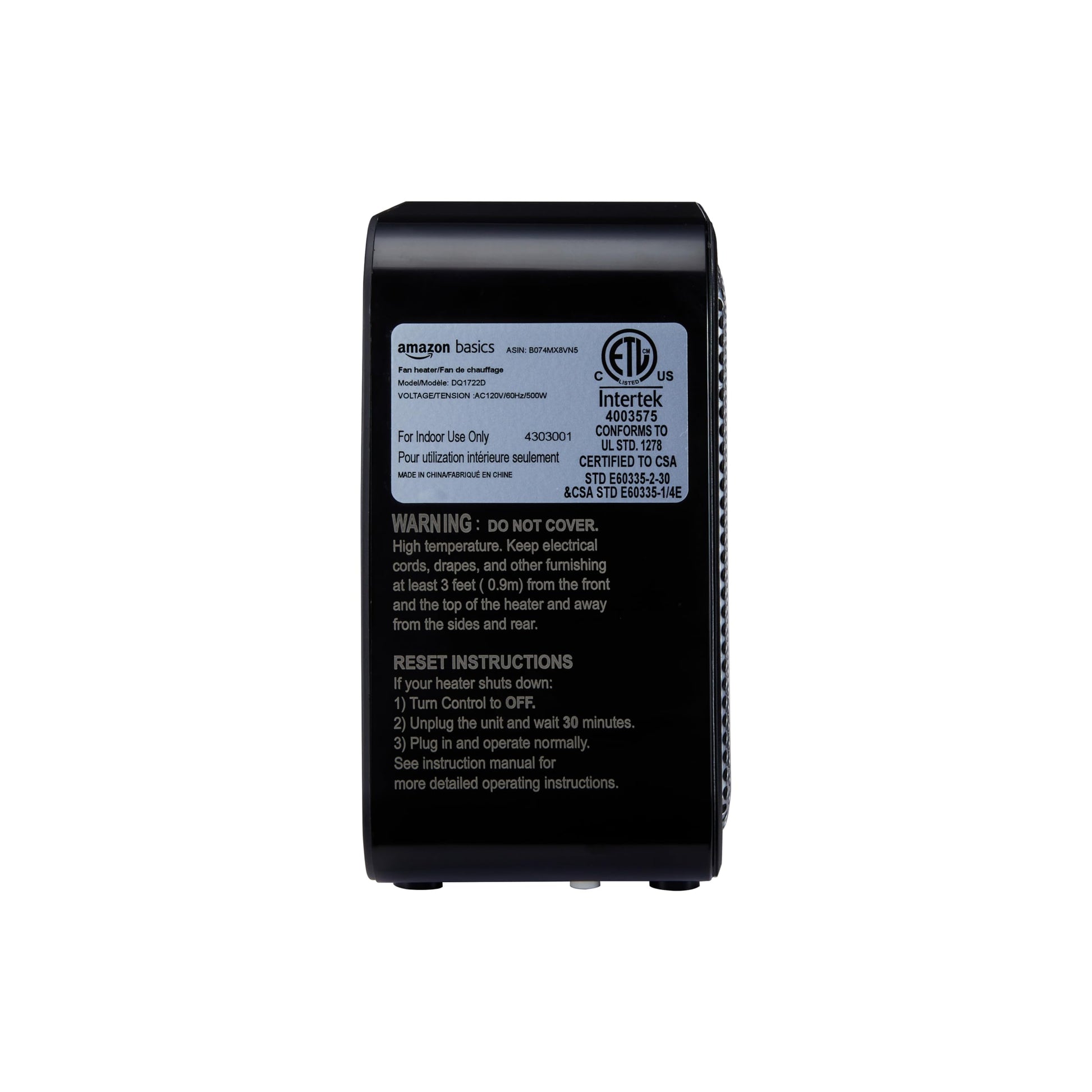 Amazon Basics Ceramic Space Heater, Mini Heater for Office Desk, Portable Tent Heater for Camping (Indoor Use), 500 W, With Tip-Over Protection, Lightweight (1.4 LBS), Black, 5.87”D x 3.15”W x 5.95”H