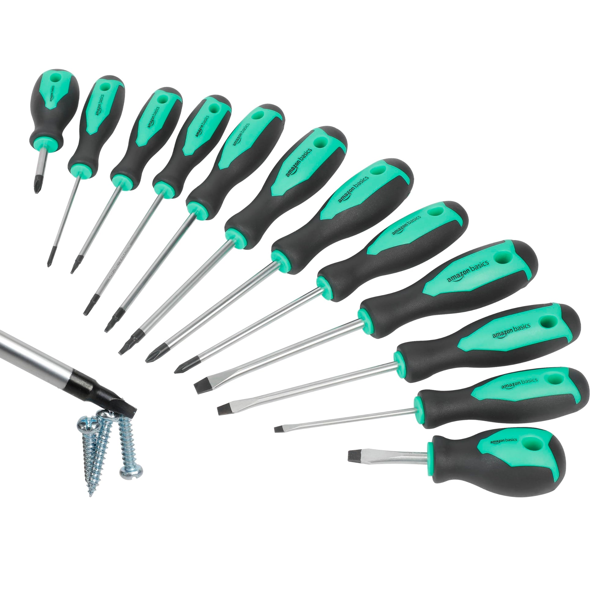 Amazon Basics Magnetic Screwdrivers Set, Includes Phillips, Slotted, Torx, Square, and Stubby Screwdrivers, 12-Piece Hand Tools Set, Turquoise