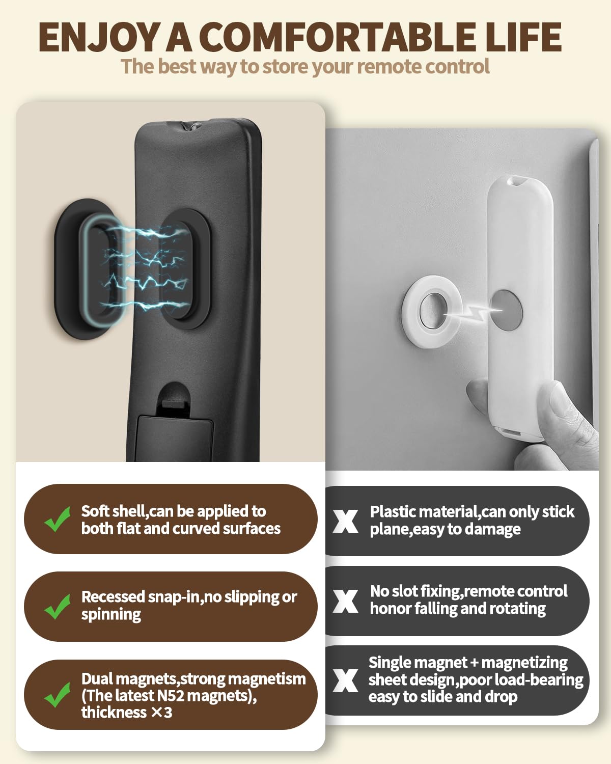 • Unmatched Magnetic Strength & Stability – Featuring upgraded N52 magnets, each magnetic remote control holder supports 250 g individually and up to 900 g with dual‑magnet setup, ensuring your TV remotes, ceiling fan remotes, and air conditioner remotes stay firmly in place without slipping