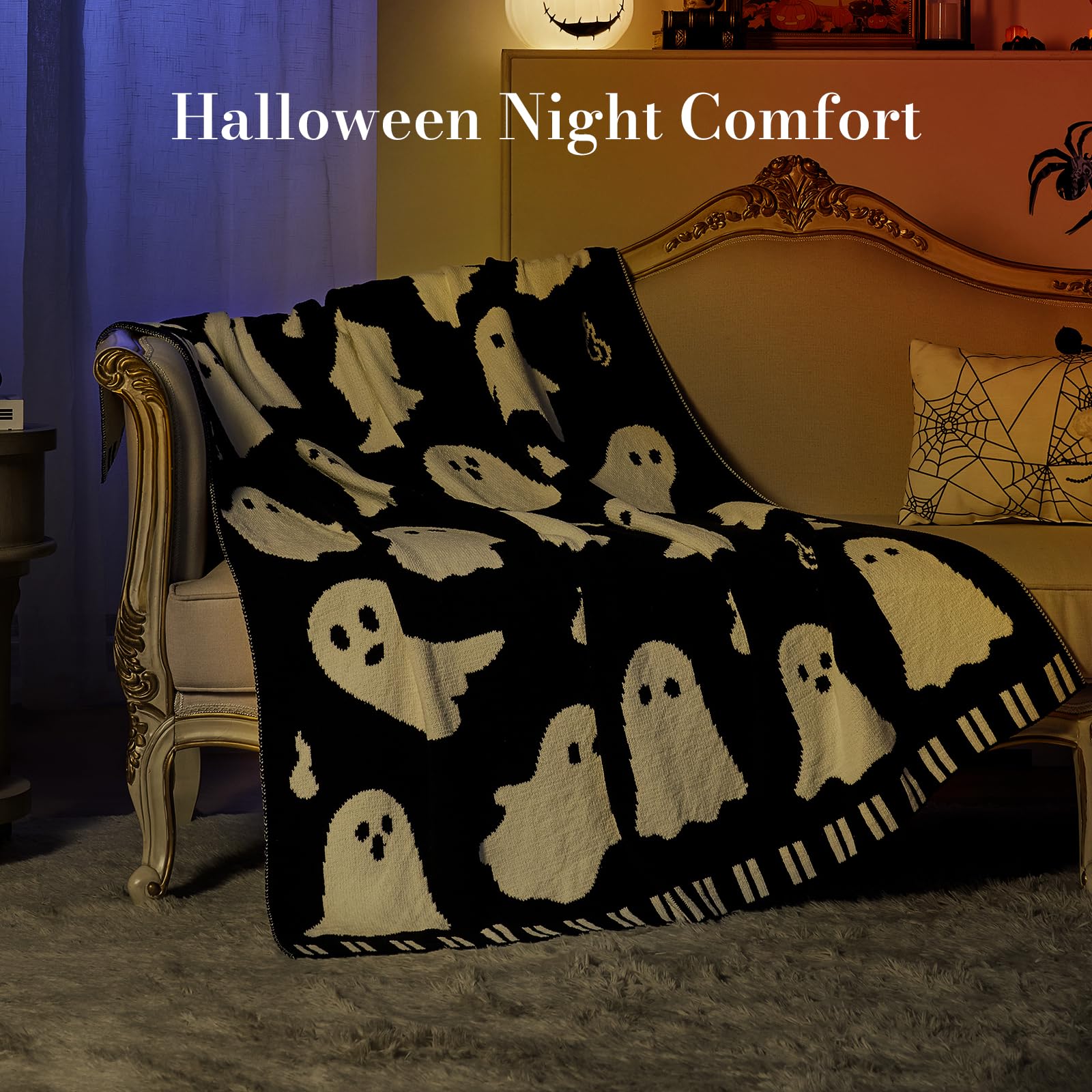 Amélie Home Reversible Halloween Throw Blanket for Couch, Spooky Halloween Ghost Cute Terror Scence, Chenille Knit Soft Cozy for Bed Sofa Home Decor Gifts, 50" x 60", Ghost