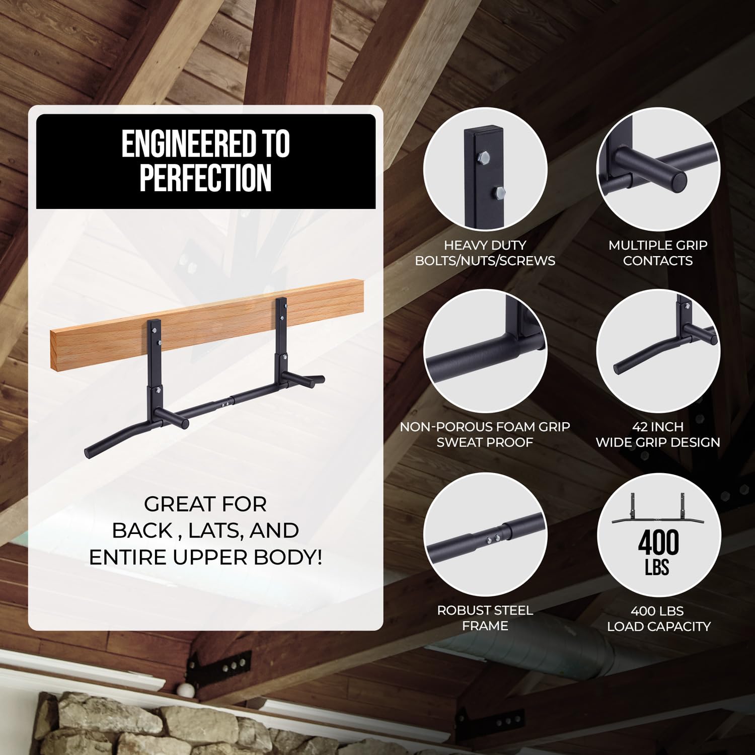 • Extra-wide 42' grip bar: Experience superior grip and comfort with a full 42' wide bar featuring a 1 1/4' padded diameter, designed to provide a secure and solid feel during your workouts.