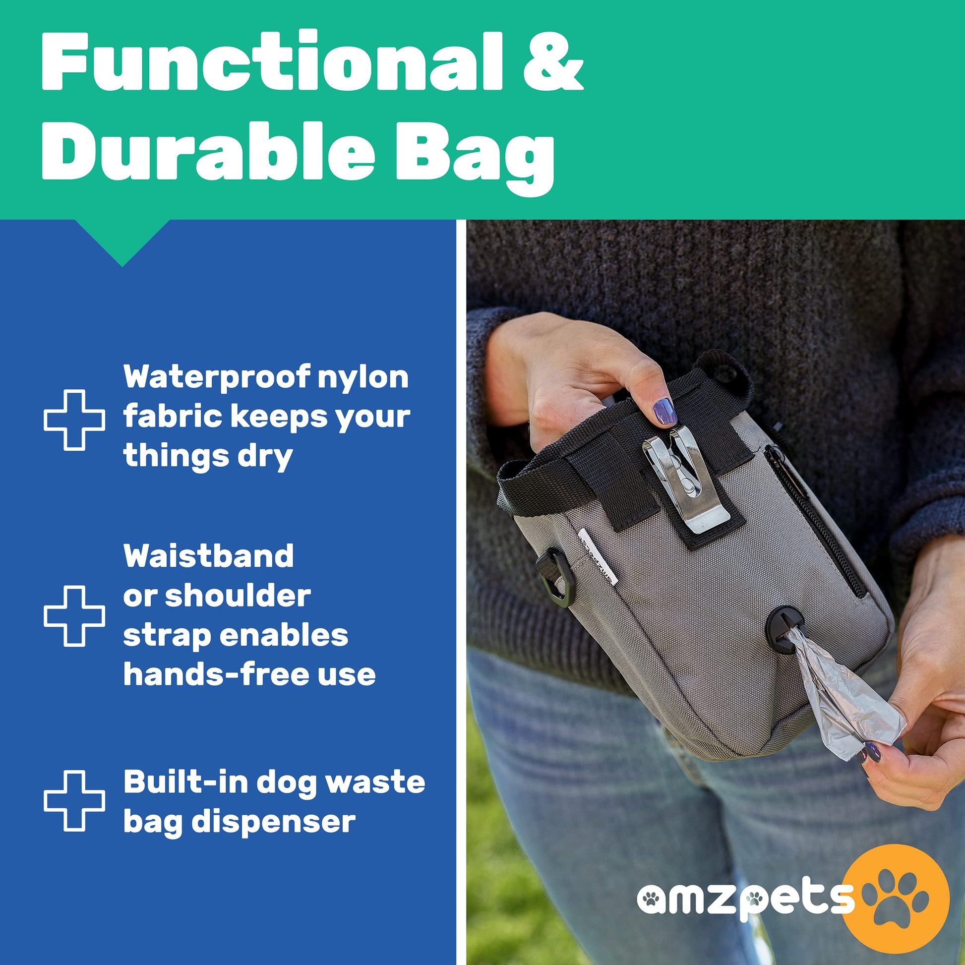 • 【Treats training pouch bag w/ poop dispenser】This treat bag holds your belongings w/ dog’s treats, kibbles, and toys during walks. Excellent weatherproof material keeps everything dry. And the built-in poop bag dispenser helps you put all the waste bags inside it and easily pull some when needed.