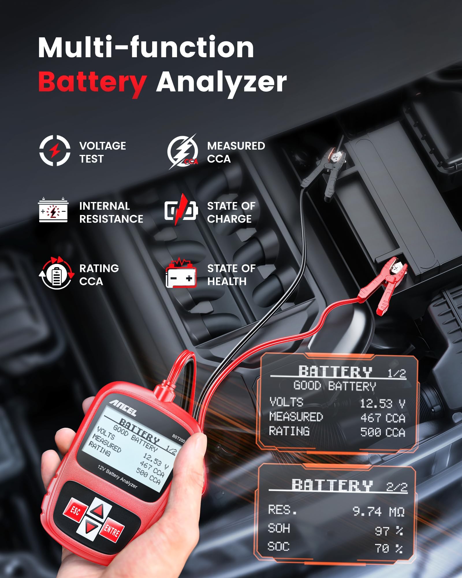 • 🔋【FASTER & 99.99% ACCURATE】ANCEL BST200 12v battery tester automotive helps you to quickly detect battery faults so that you can replace it in time for the warranty period. Whether it's a hot summer day or a cold winter day, you can choose to test your battery OUT OF VEHICLE or IN VEHICLE, which is convenient and SAVES your TIME and MONEY