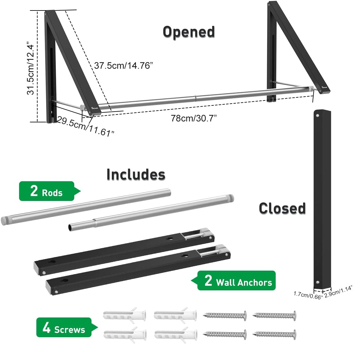 Anjuer Retractable Clothes Rack - Wall Mounted Folding Clothes Hanger Drying Rack for Laundry Room Closet Storage Organization, Aluminum, 2 Racks with Rod (Black)