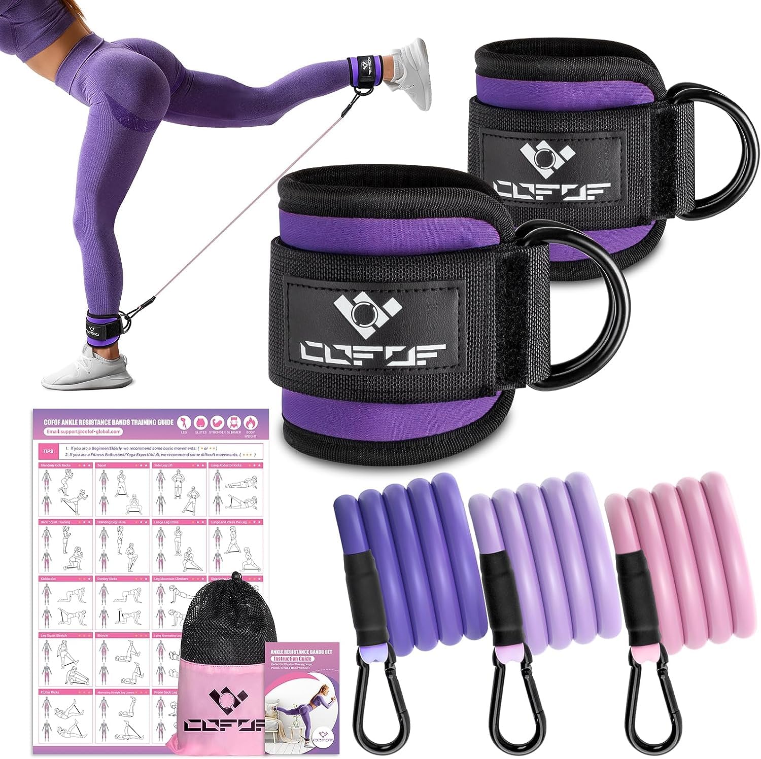 • [COFOF ANKLE RESISTANCE BANDS] We are always committed to allowing buyers to buy high-quality products while enjoying perfect services. Our Ankle Resistance Band Kit includes 2 Ankle Straps, 3 100% Natural Latex Bands, 1 Instruction Guide, 1 Training Posters and 1 Mesh Carry Bag. If you have any questions, please feel free to contact us.