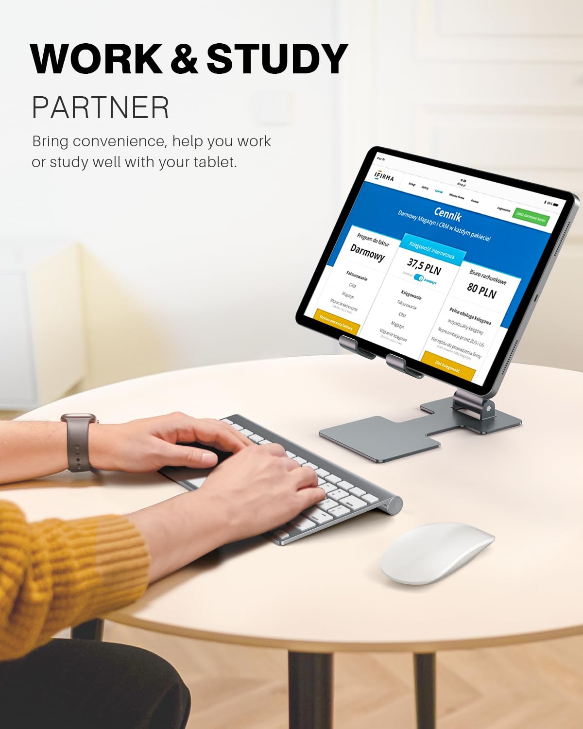 • 💼[Fully Foldable to Pocket Size]: The tablet stand for desk can be fully folded flat for easy storage, perfectly to fits in the pocket or slip into a bag. Small footprint only taking up little place on your desk, counter or kitchen. Compact and portable to carry out for travel.