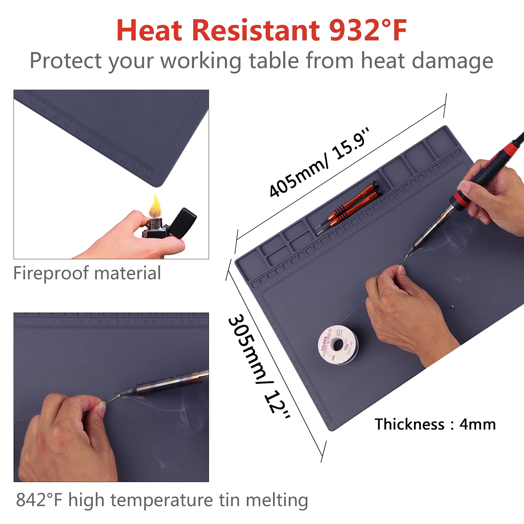 • 🥇 【Heat Resistant 932°F and Big Size 】-The anti static mat is resistance to high temperature of 932°F protect your desk from burning and ruining. Compared with rubber materials mat, it has better heat resistance at high temperature. Meanwhile, the Mat has big size 15.9’’ x 12’’provide bigger space to satisfy many projects like for repairing mobile phone, computer circuit board, iPad, camera so on electronics.It’s great for professional repair store, DIY handyman and electronics workshop.