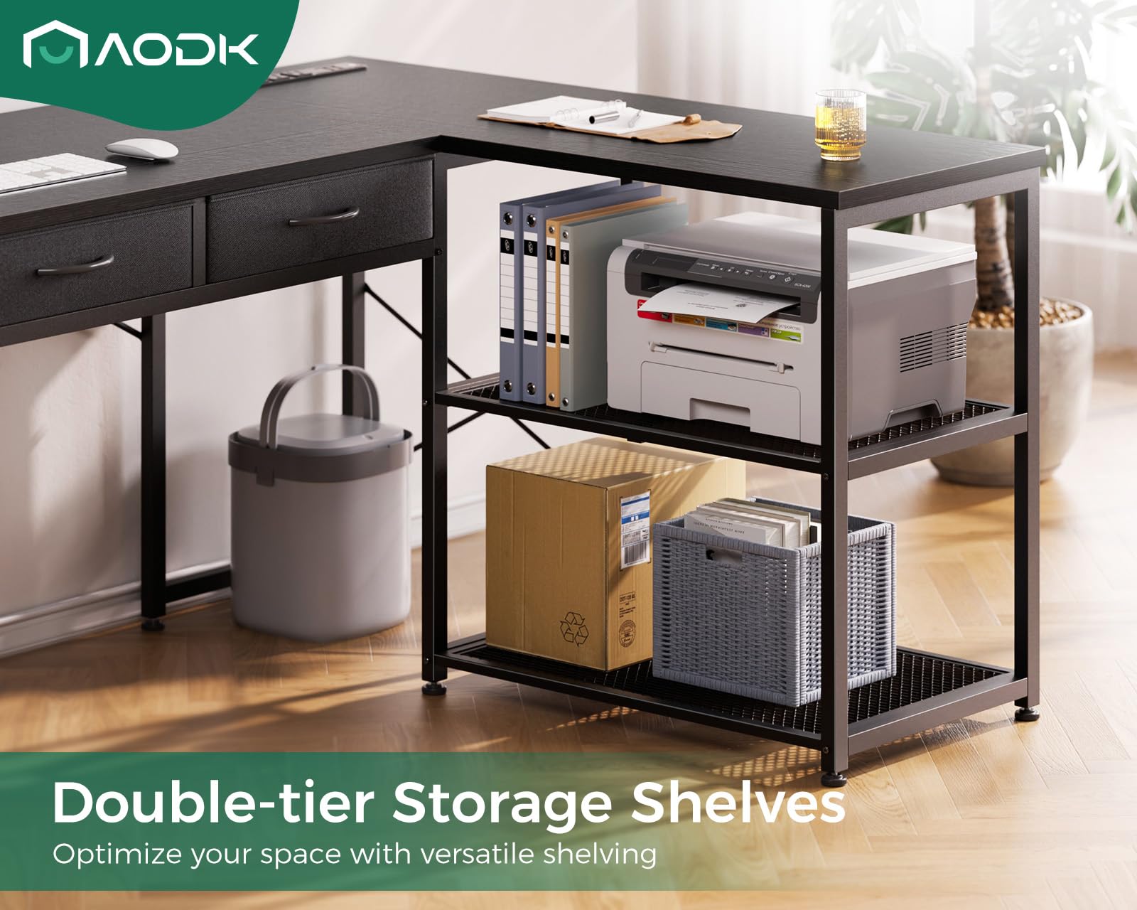 AODK 53 Inch L Shaped Computer Desk with Drawers, Corner Desk with Power Outlets & Reversible Storage Shelves, Movable CPU Stand for Home Office Gaming, Black