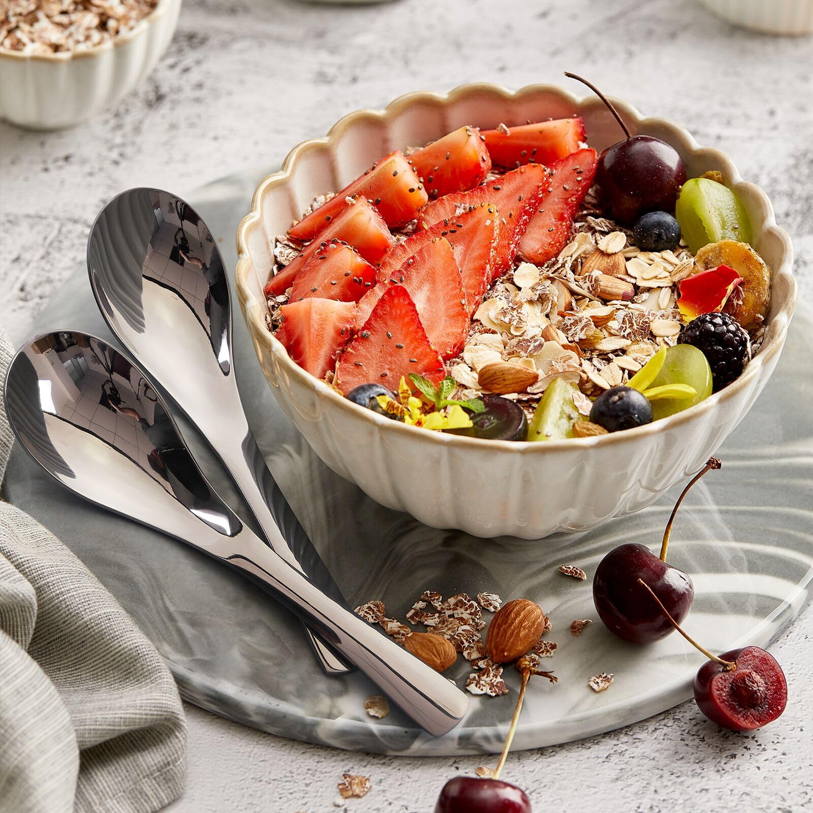 • Premium Thick & Ergonomic Handle: Our tablespoons crafted from high-grade Stainless Steel, Durable & Sturdy, Superior Quality Mirror Finished Surface, Smooth Edge definitely no rough spot, the ergonomic handle design makes more comfortable when you hold it.