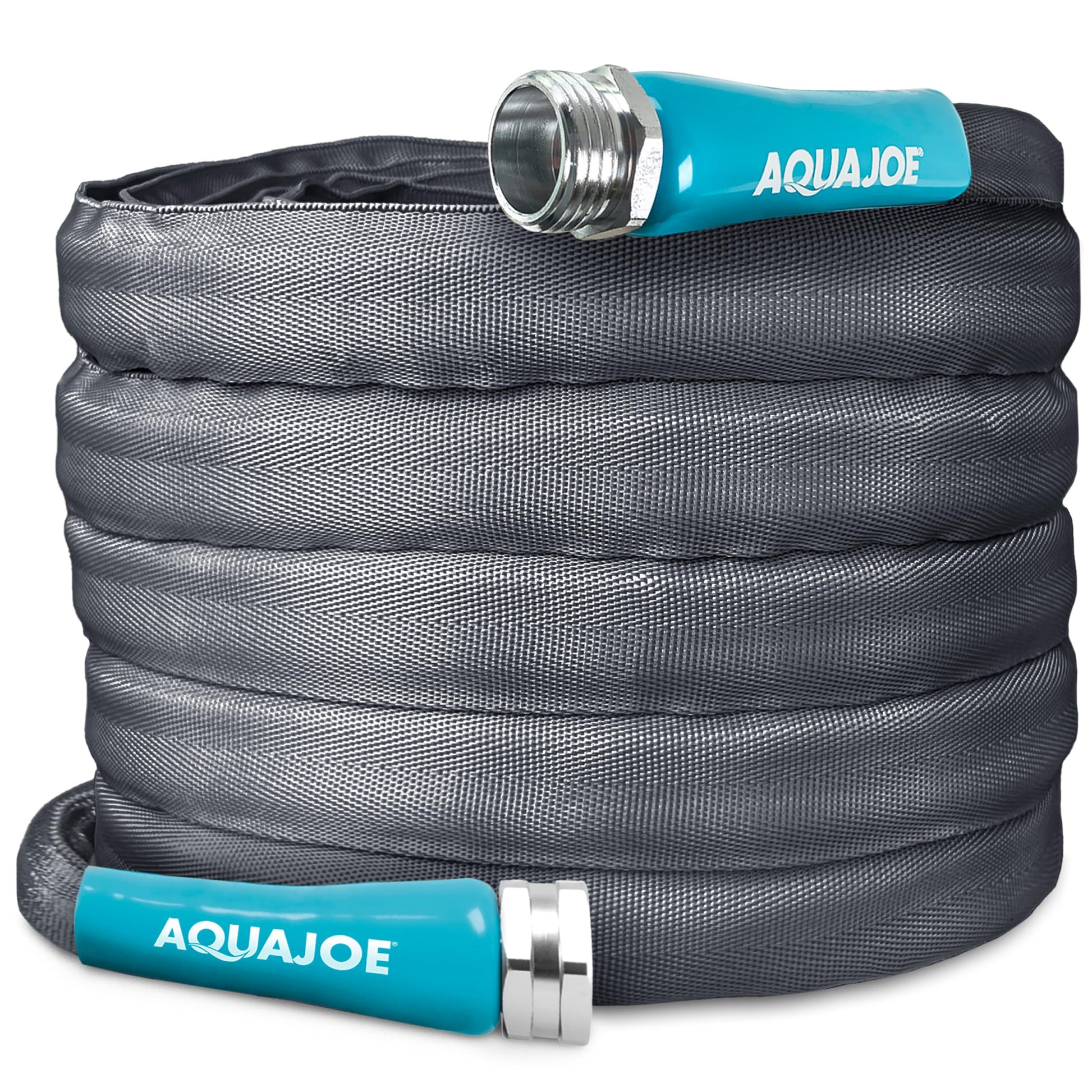 Details: Constructed from a rugged, marine grade fiber jacket surrounding a 5/8-inch flexible inner core, the rip and abrasion-resistant fabric is safe on delicate and painted surfaces no scratching, scuffing or snagging! The innovative, dual-layer design is crush-proof and built to withstand the toughest treatment all while maintaining flexibility down to 0 degrees Fahrenheit. Plus, AQUAJOE is weather resistant and dries quickly, so you dont have to pick up a heavy, wet or slippery hose. Equipped with durable metal fittings for a solid, leak-proof connection, AQUAJOE is kink-, twist- and tangle-free for uninterrupted flow when watering your yard or garden. BPA-free, Lead-free and Phthalate-free, AQUAJOE is up to 50% lighter than conventional hoses, and provides maximum durability plus performance, and coils easily for compact storage. AQUAJOE comes in a variety of convenient lengths to fit any size lawn, auto, boat, garden and more!