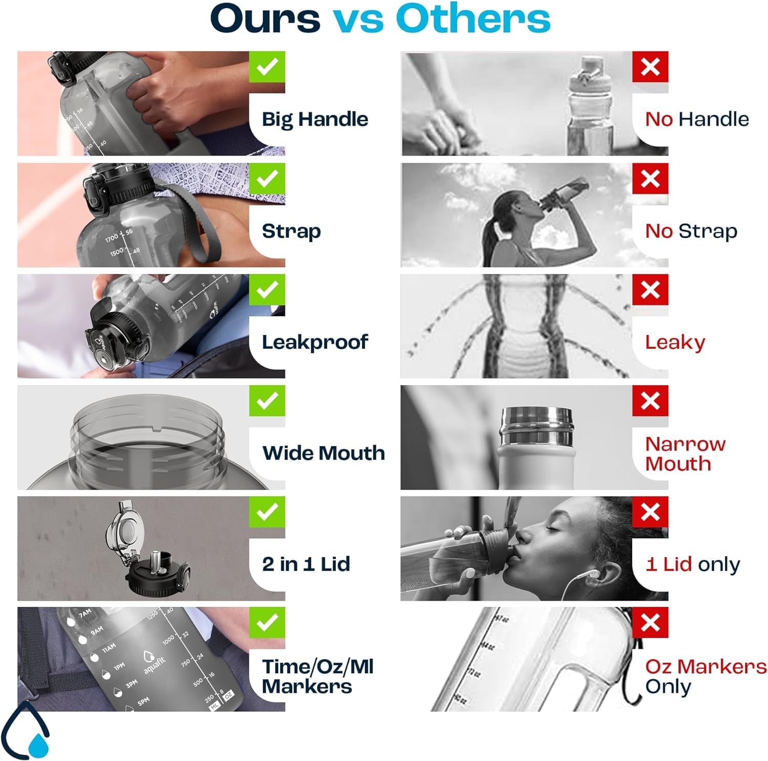 • Large 1 gallon capacity - Our 1 gallon water bottle with straw is durable, light and portable. Drink all the water you need and forget about refills: this large water bottle is perfect for an on-the-go lifestyle!