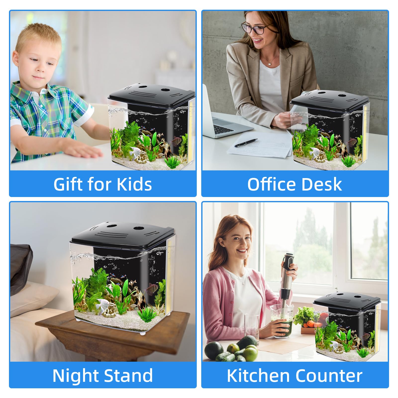 • Compact Size: The tank is lightweight, cute and small and it doesn't take up too much space on the desktop or a kitchen counter. (Note: If the current is a bit strong, you can put a pre-filter sponge filter on the intake to reduce the water flow.)