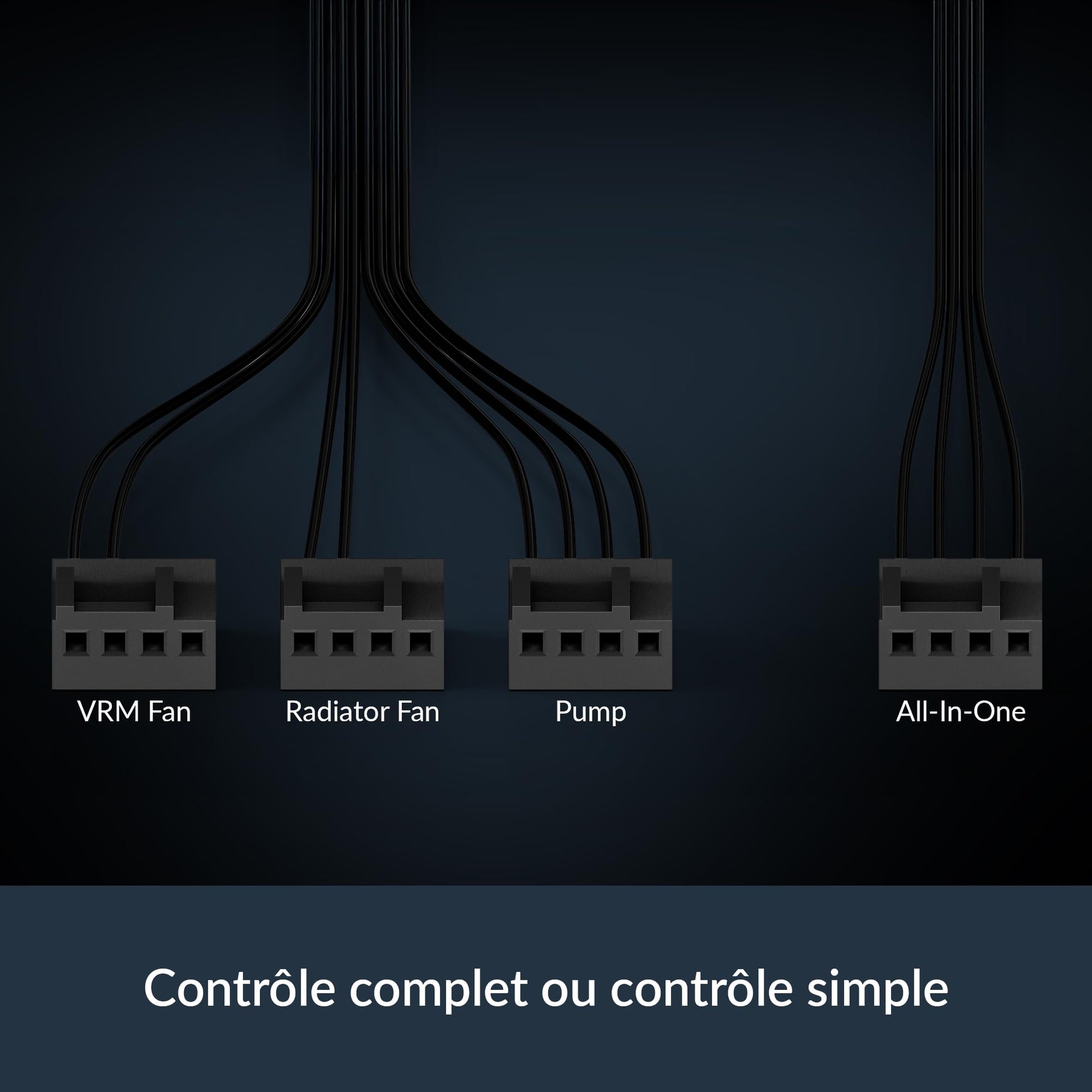• INTEGRATED CABLE MANAGEMENT: The PWM cables of the radiator fans are integrated into the sleeve of the tubes, so only a single visible cable connects to the motherboard