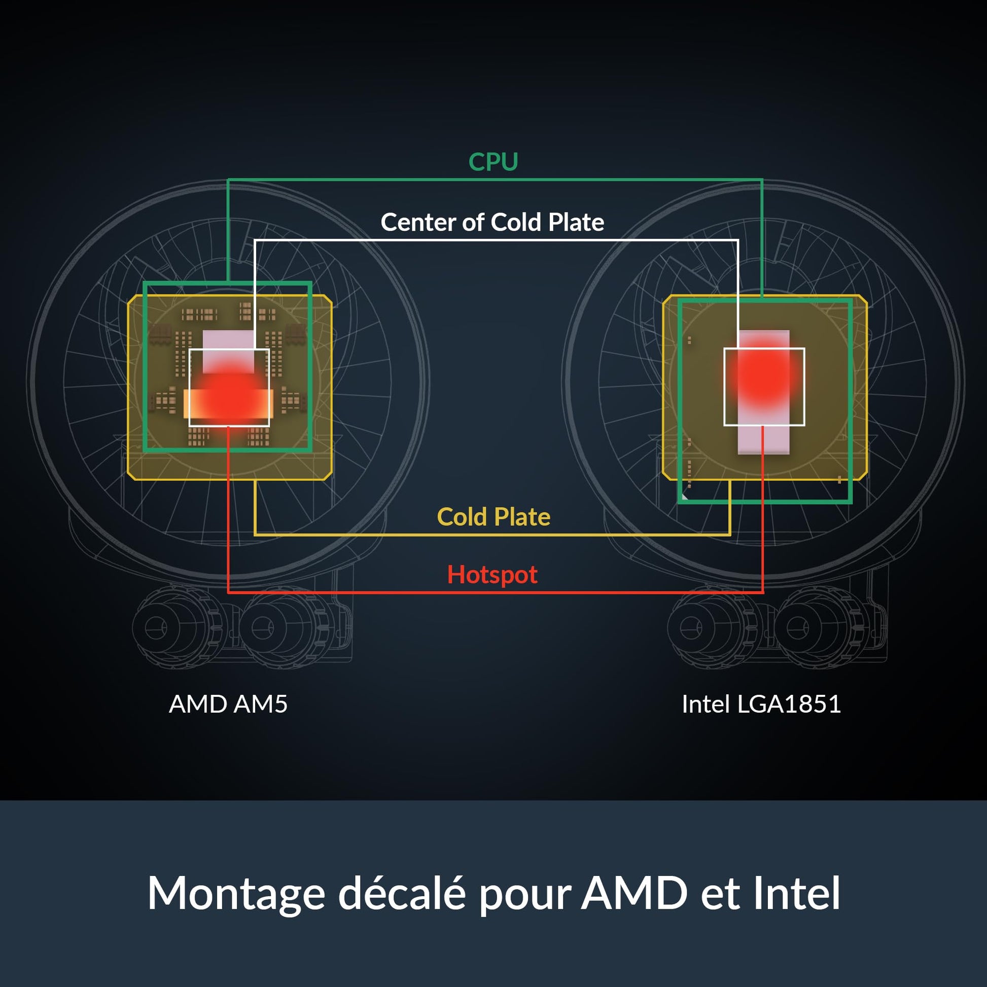 • NATIVE OFFSET MOUNTING FOR INTEL AND AMD: Shifting the cold plate center toward the CPU hotspot ensures more efficient heat transfer